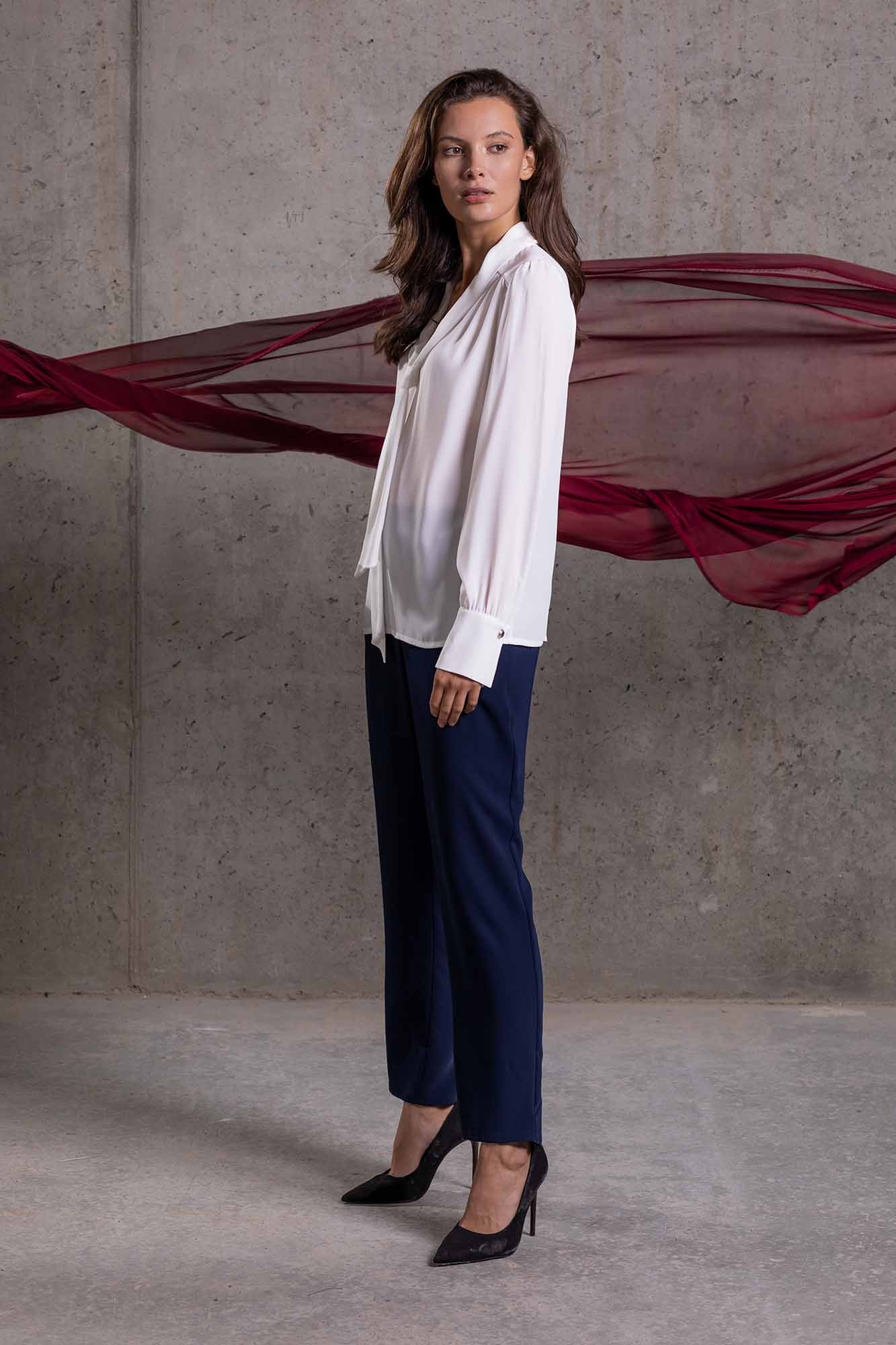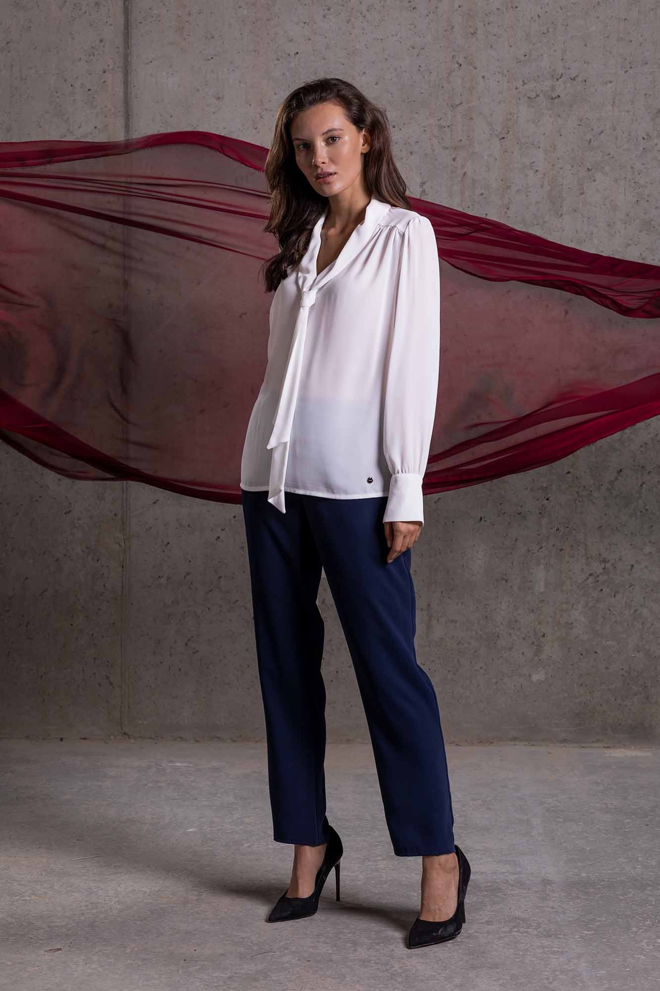 Granatowe eleganckie spodnie. Uszyte z miękko układającej się tkaniny. Ten model spodni posiada wpuszczane, ukośne kieszenie. Na obwodzie talii z przodu wszyty został pasek, z przodu z imitacją rozporka, zaś z tyłu szeroka gumka, ułatwiająca zakładanie spodni. Nogawki lekko zwężają się ku dołowi. Ten model jest dostępny do rozm. 52.