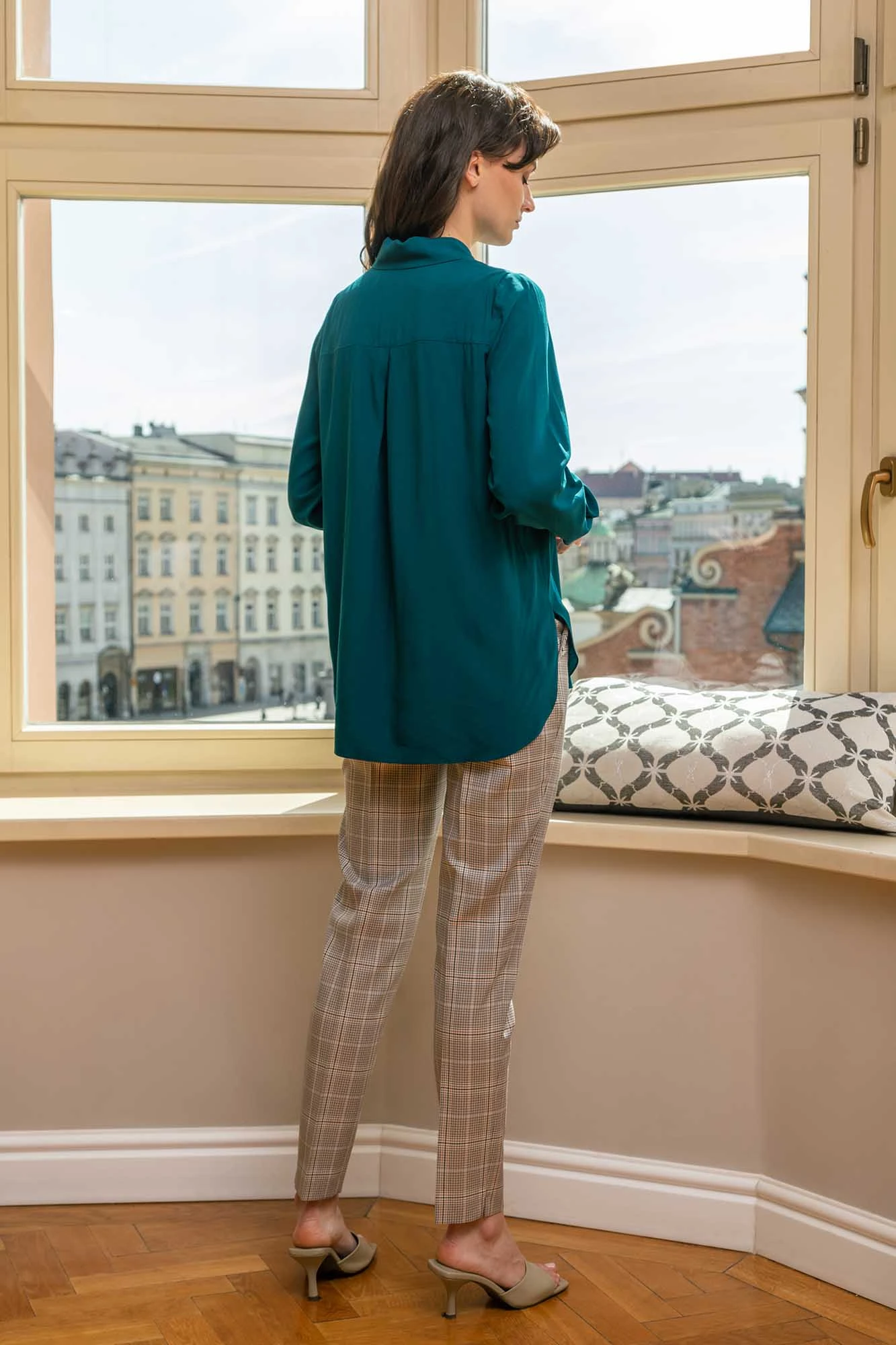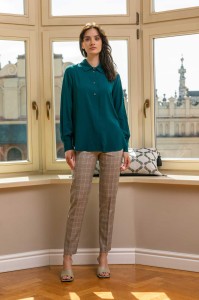 Bluzka koszulowa z wysokogatunkowej tkaniny wiskozowej. Rozpinana na całej długości. Długie rękawy zakończone mankietami zapinanymi na dwa guziki. Na plecach wszyty został karczek, poniżej którego znajduje się, podkreślająca luźny fason bluzki, kontrafałda. Dół jest zaokrąglony, krótszy z przodu, a nieco dłuższy z tyłu. Długie rozcięcia po bokach dają możliwość wpuszczenia przodu bluzki w spodnie, natomiast tył może swobodnie opadać.