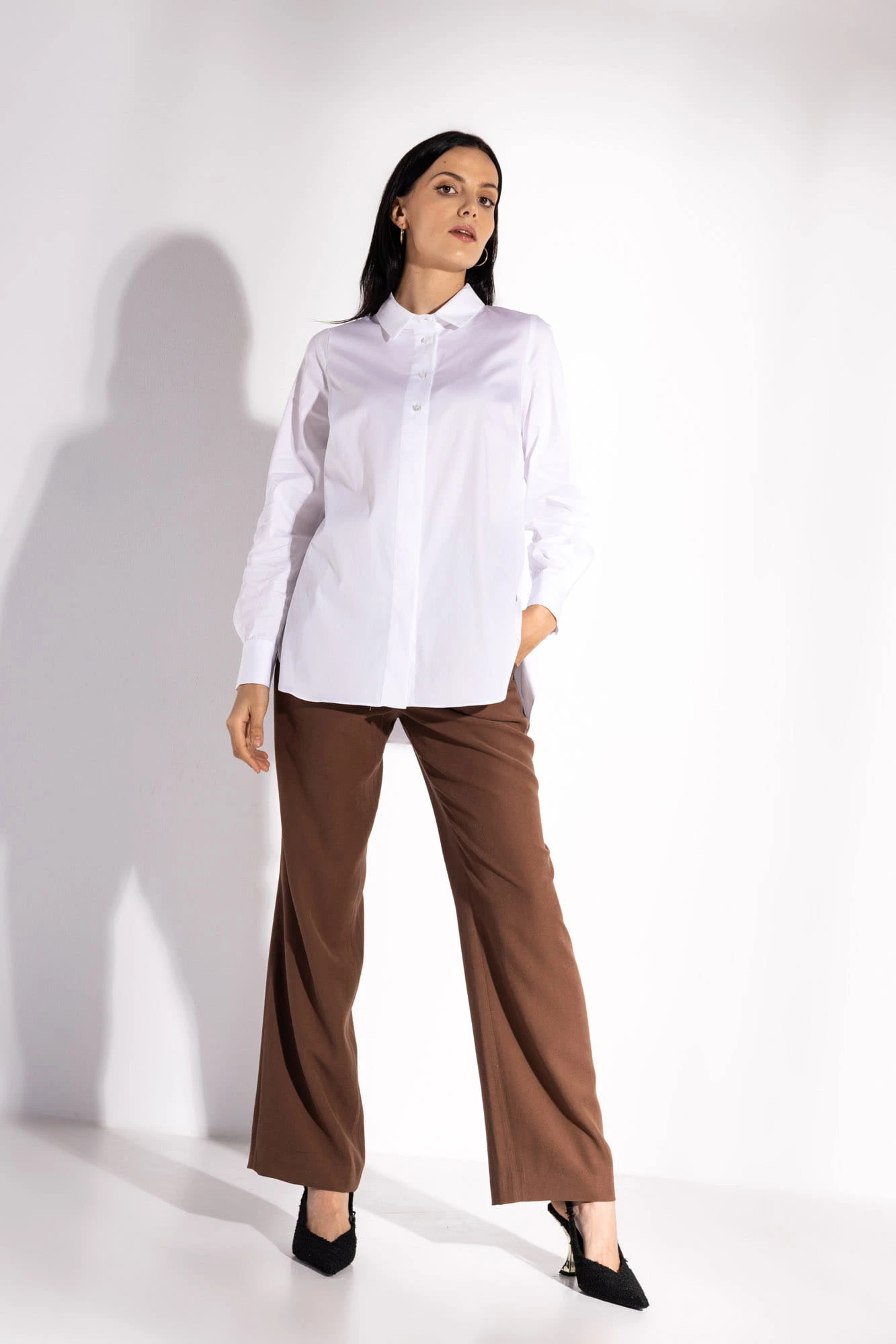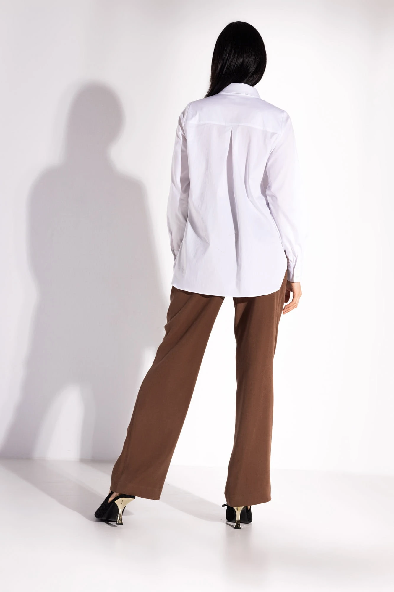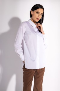Biała klasyczna koszula. Uszyta z komfortowej dla skóry tkaniny bawełnianej, z domieszką nylonu sprawiającego, że bluzka jest niezwykle gładka i lekko elastyczna. Klasyczny kołnierzyk. Rozpinana na całej długości, część guzików od góry jest widocznych, natomiast pozostałe ukryte pod listwą. Długie rękawy zakończone zostały mankietami zapinanymi na dwa guziki. Na plecach znajduje się karczek, poniżej którego odszyto, podkreślającą luźny fason bluzki, kontrafałdę.Dół bluzki jest zaokrąglony.