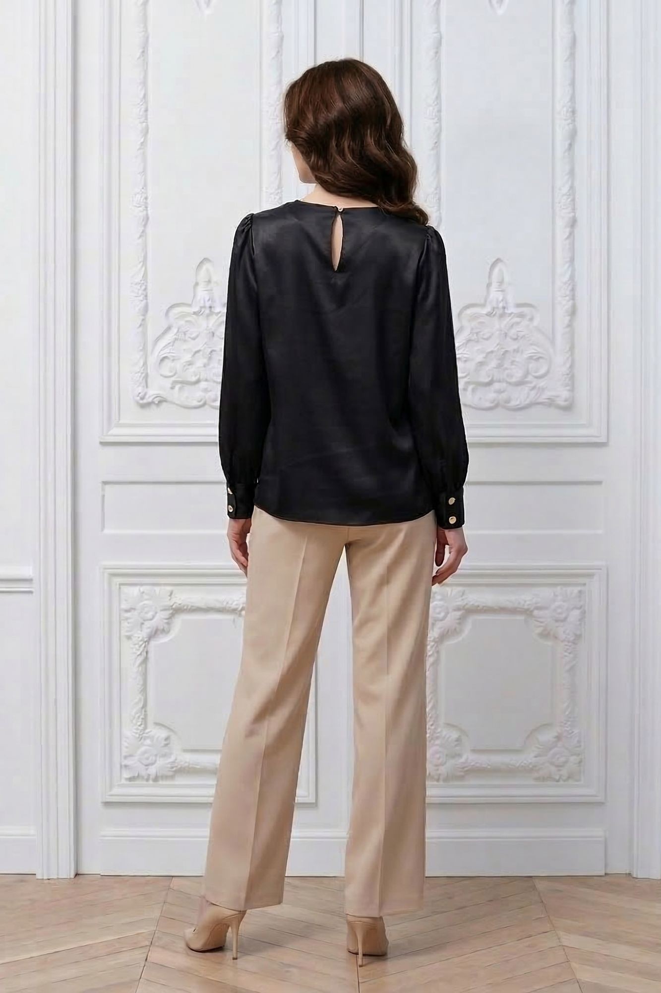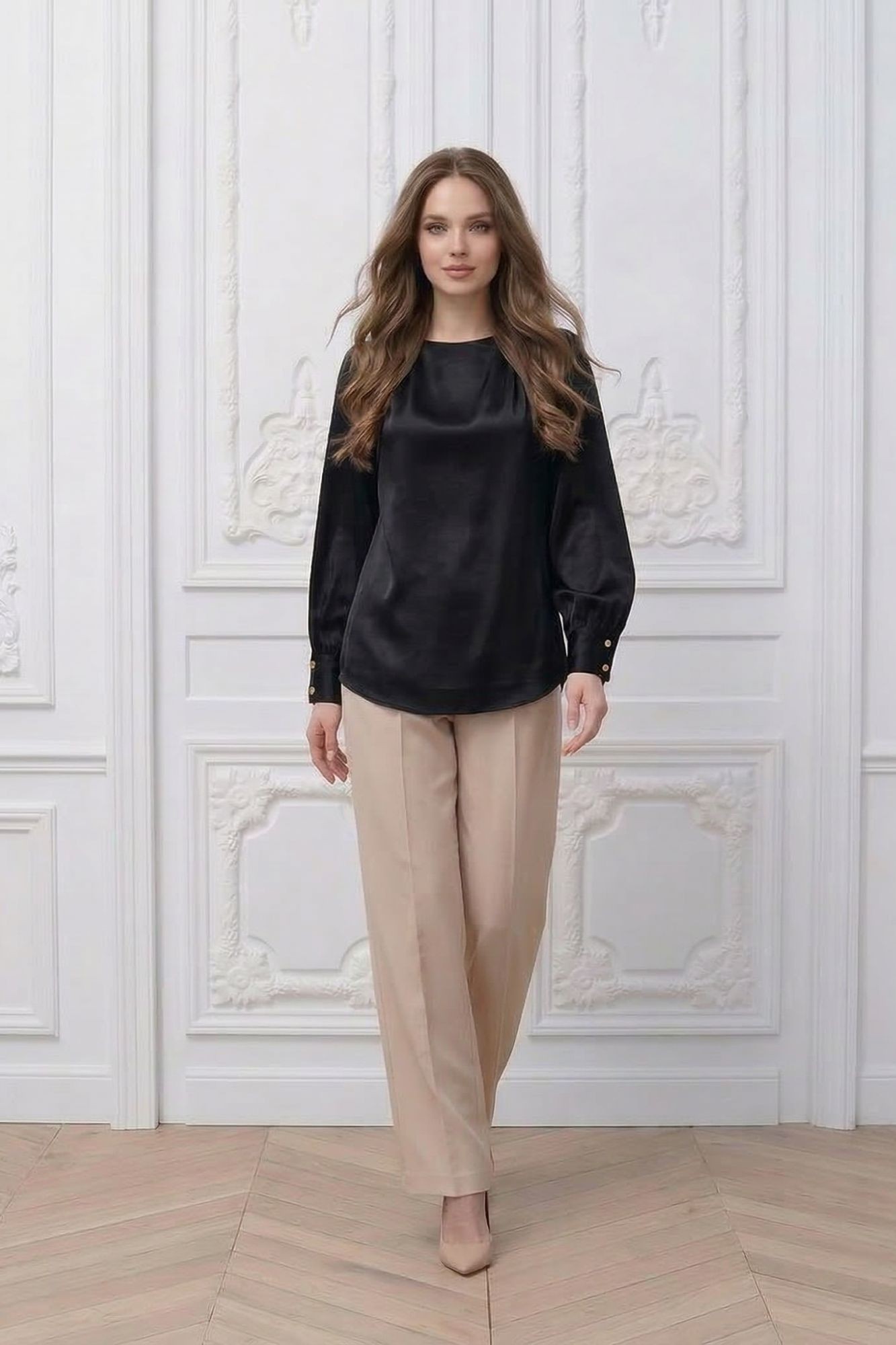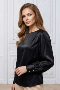 Elegancka bluzka satynowa z przewagą włókien wiskozowych, subtelnie połyskuje i miękko układa się na sylwetce. Ma prosty, klasyczny krój wykończony delikatnymi pęknięciami po bokach, dzięki czemu zapewnia swobodę ruchów i lekkość w odbiorze. Okrągły dekolt podkreśla minimalistyczny charakter modelu, a na lewym ramieniu znajdują się dwie ozdobne zakładki, które dodają całości wyrafinowania. Rękawy są lekko przymarszczone u góry, co nadaje im subtelnej objętości, a szerokie mankiety zapinane na dwa guziki w złotym kolorze podkreślają elegancki styl bluzki. Z tyłu znajduje się niewielkie zapięcie na jeden guzik, które ułatwia zakładanie.