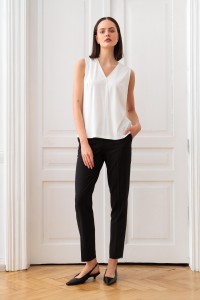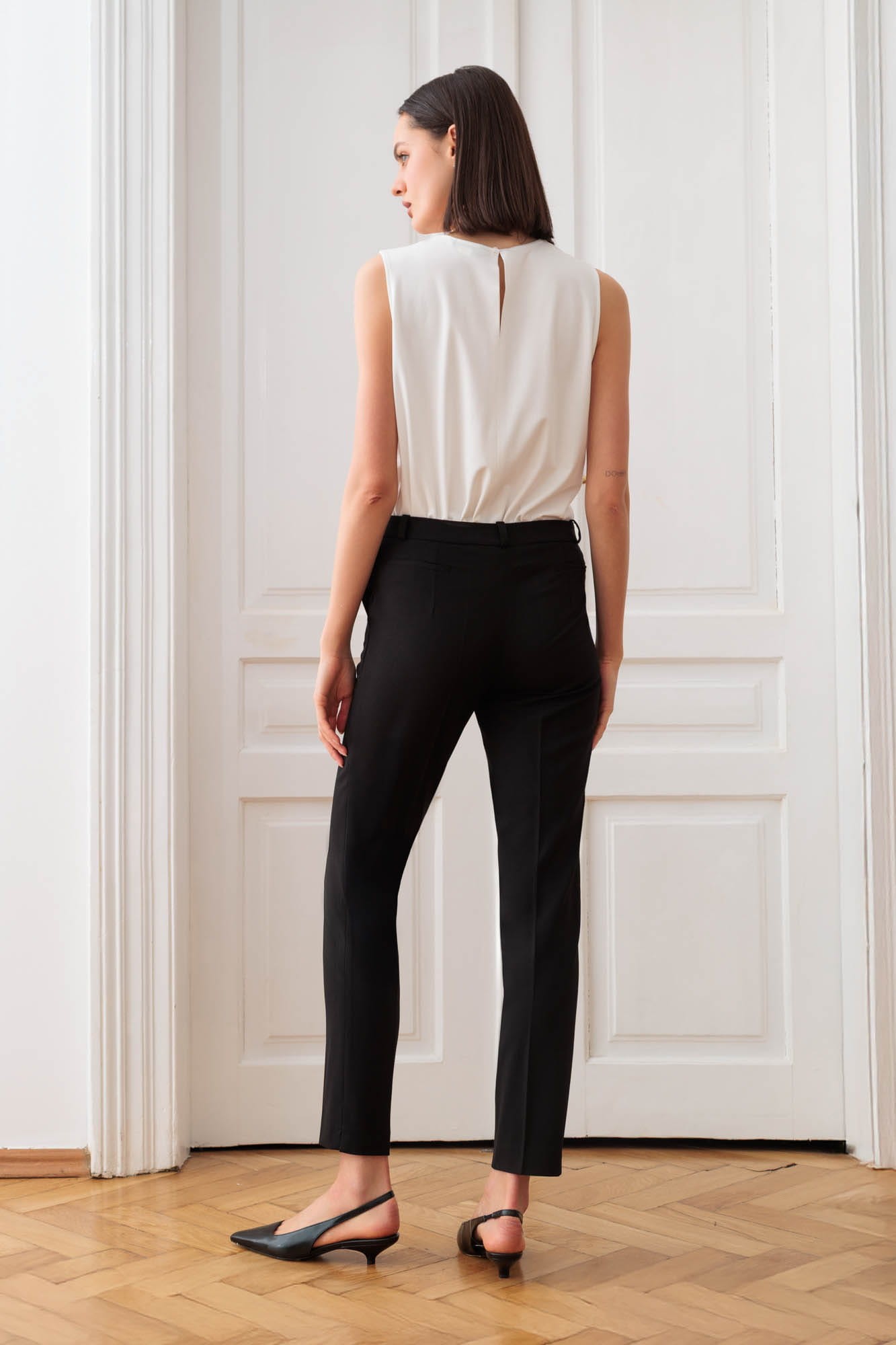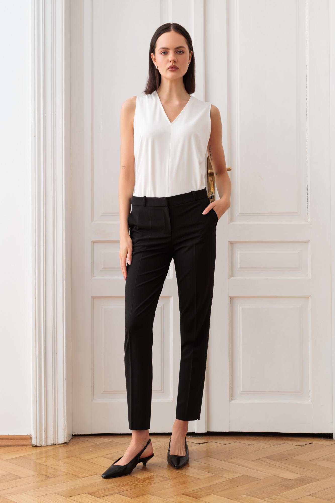 Czarne klasyczne spodnie o eleganckim kroju oraz materiale z domieszką włókien wiskozowych zaprojektowane z myślą o podkreśleniu sylwetki i stylowym wyglądzie. Zwężane nogawki w kant zakończone subtelnym pęknięciem, dodają nowoczesnego akcentu i wysmuklają linię nóg. Zapinane są na dyskretny kryty zamek oraz haftkę, który zachowuje estetykę całości. Spodnie posiadają wpuszczane kieszenie. Z tyłu odszyte zostały zaszewki doskonale dopasowujące ten model w talii oraz ramki imitujące kieszonki, zapewniając minimalistyczny i elegancki wygląd. Wszyty pasek z szlufkami dodaje funkcjonalności i pozwala na dopasowanie do ulubionych dodatków, takich jak paski czy ozdobne akcesoria.