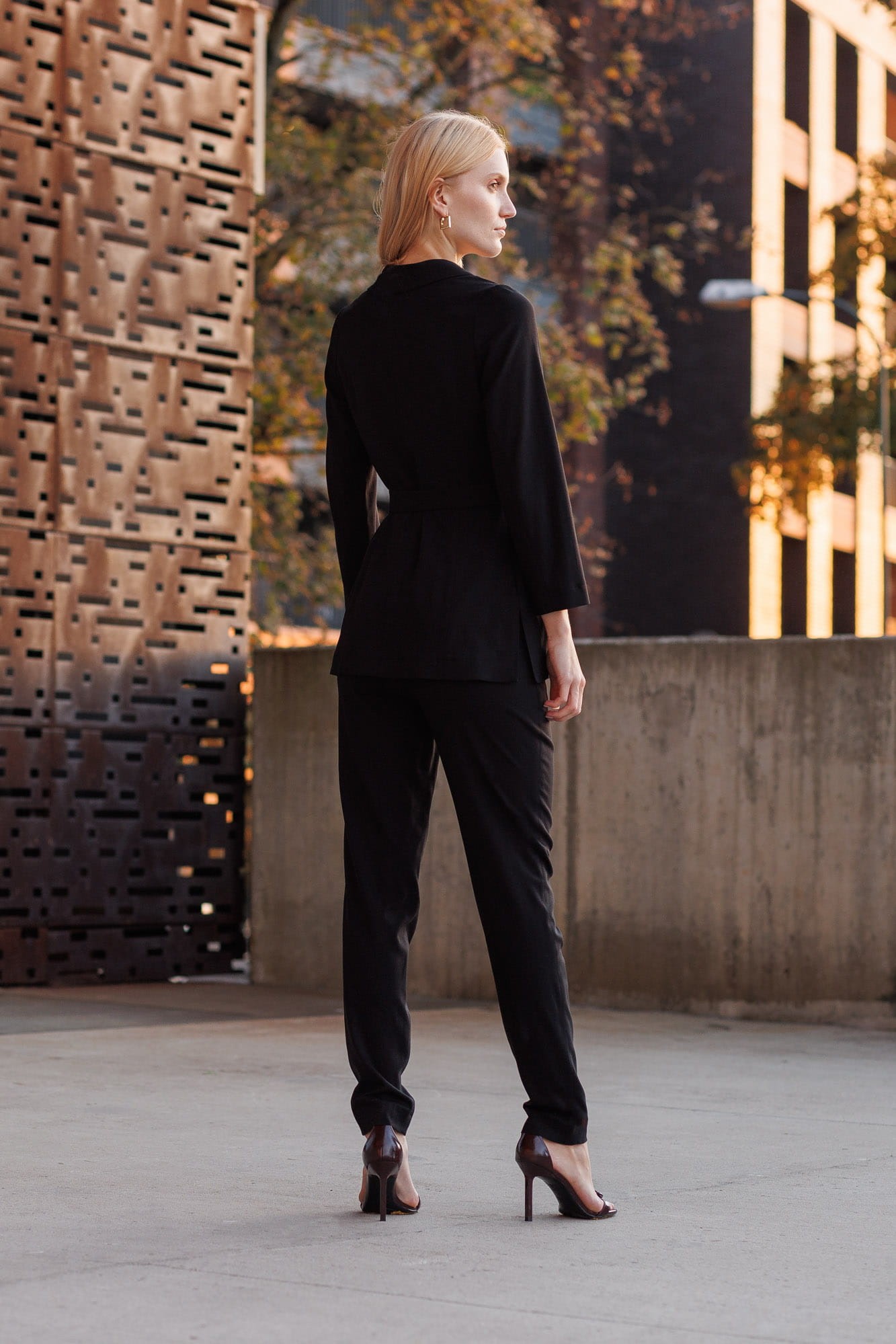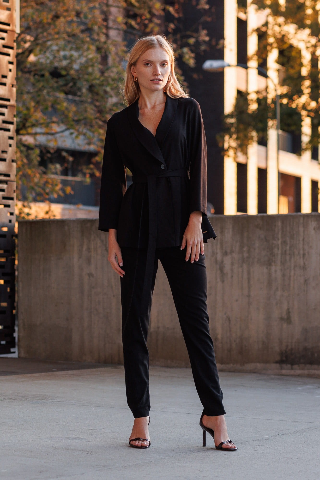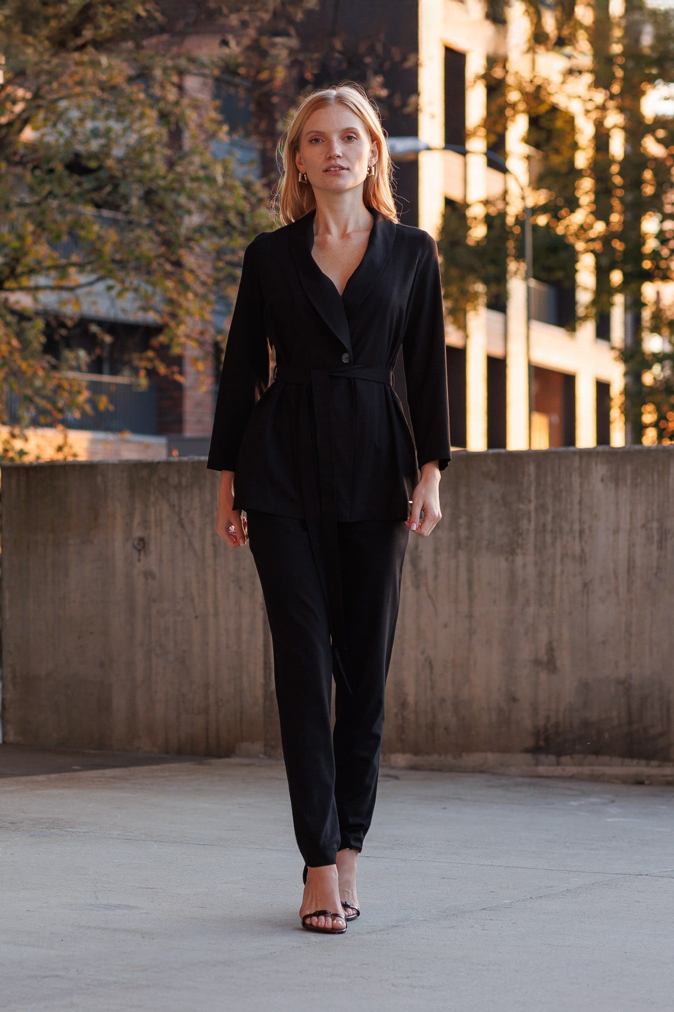Wiskozowy, przedłużany żakiet. Dzięki długim zaszewkom oraz zapięciu na dwa guziki lekko dopasowuje się do sylwetki. Talię dodatkowo podkreśla materiałowy pasek umocowany szlufkami. Na linii bioder znajdują się wpuszczane kieszenie oraz rozcięcia, które wraz z rękawami o długości 7/8 nadają żakietowi swobodny charakter. Ten model nie posiada podszewki.