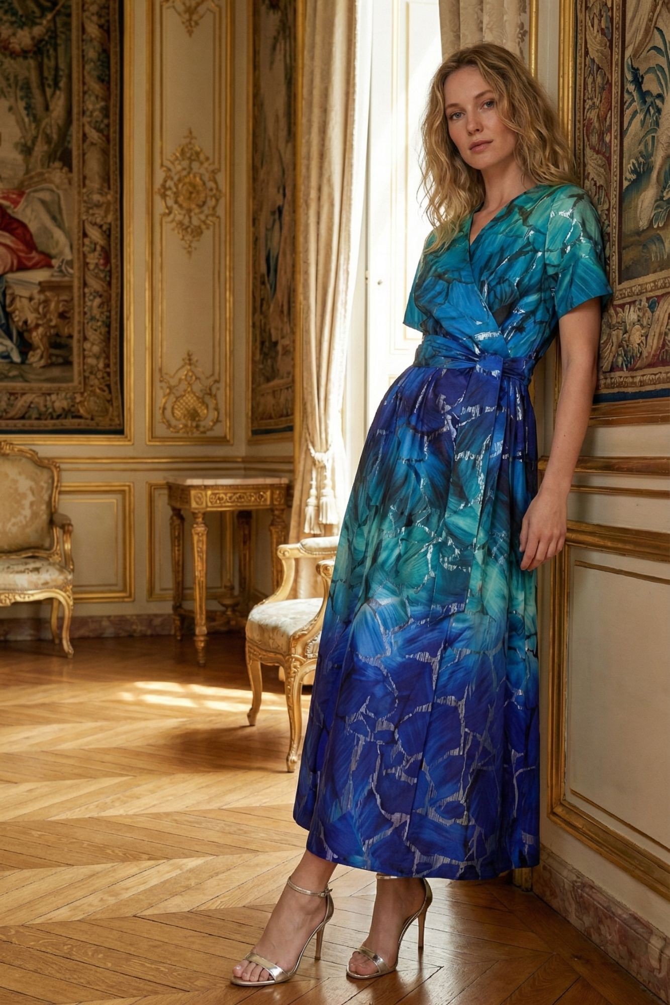 Długa, elegancka sukienka, to wyjątkowa propozycja dla kobiet ceniących elegancję połączoną z nowoczesnym stylem. Wykonana z efektownej tkaniny o subtelnym połysku, zachwyca gradientowym przejściem kolorów od intensywnego turkusu, w górnej części, po głęboki granat w dolnej, co nadaje kreacji głębi i wyrazistości. Całość zdobią srebrzyste, abstrakcyjne wzory, które dodają sukience artystycznego charakteru. Krój z kopertowym dekoltem i krótkimi rękawami podkreśla kobiecą sylwetkę, a szeroka szarfa wiązana w talii w efektowną kokardę, modeluje figurę i dodaje lekkości. Długość oraz lekko rozkloszowany dół sprawiają, że sukienka prezentuje się niezwykle szykownie i z klasą. Sukienka zapinana jest na lewym boku, na kryty suwak, w górnej części sukienka posiada podszewkę.