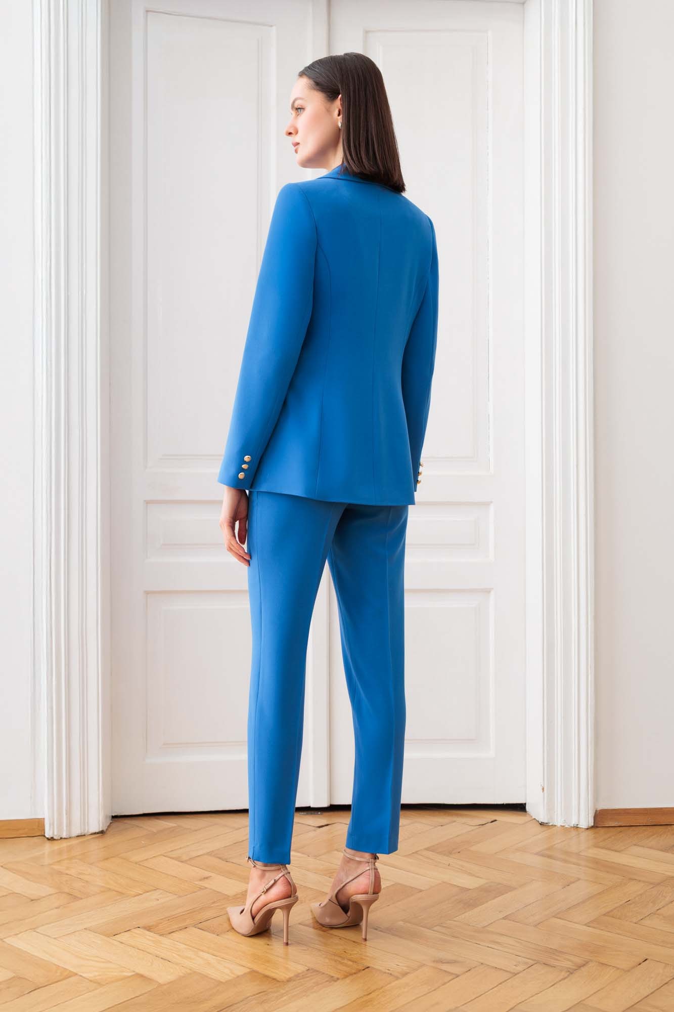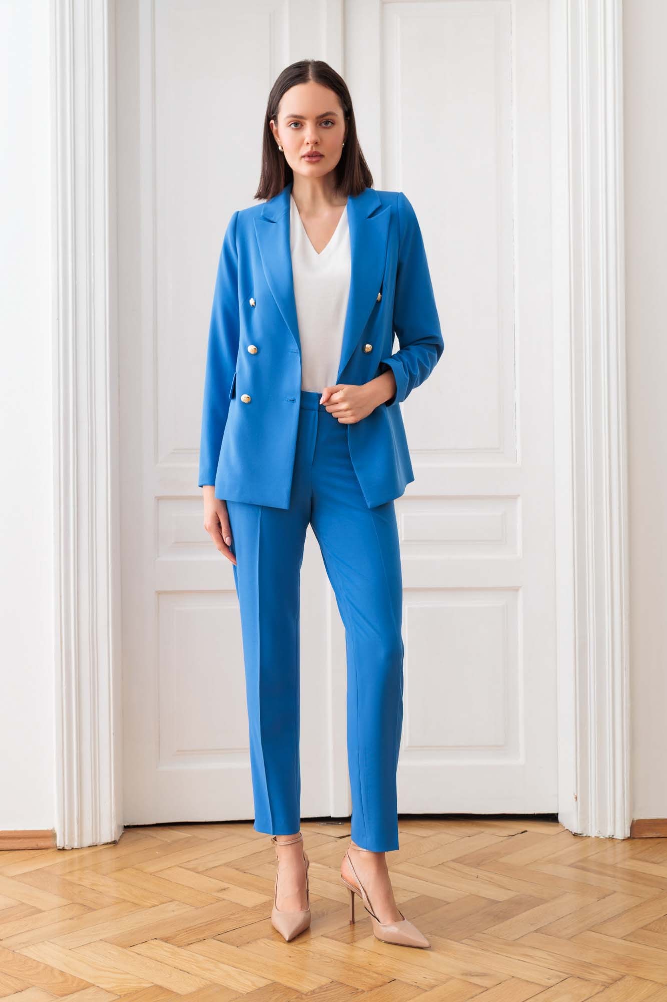 Elegancki dwurzędowy żakiet w głębokim, niebieskim odcieniu, który emanuje klasycznym stylem i wyrafinowaniem. Żakiet zapinany na efektowne guziki w kolorze złota, które dodają mu luksusowego charakteru. Przód i tył żakietu są precyzyjnie modelowane zaszewkami, które podkreślają sylwetkę, zapewniając idealne dopasowanie i elegancki wygląd. Żakiet posiada lekko wydłużane klapy, które nadają mu współczesny styl, jednocześnie zachowując klasyczne proporcje. Żakiet posiada kieszenie zakończone patkami, dodające mu funkcjonalności i dekoracyjnego akcentu. Wnętrze żakietu wykończone jest podszewką w idealnie dopasowanym kolorze, która harmonizuje z niebieskim tonem całości, zapewniając komfort noszenia i estetyczne wykończenie.