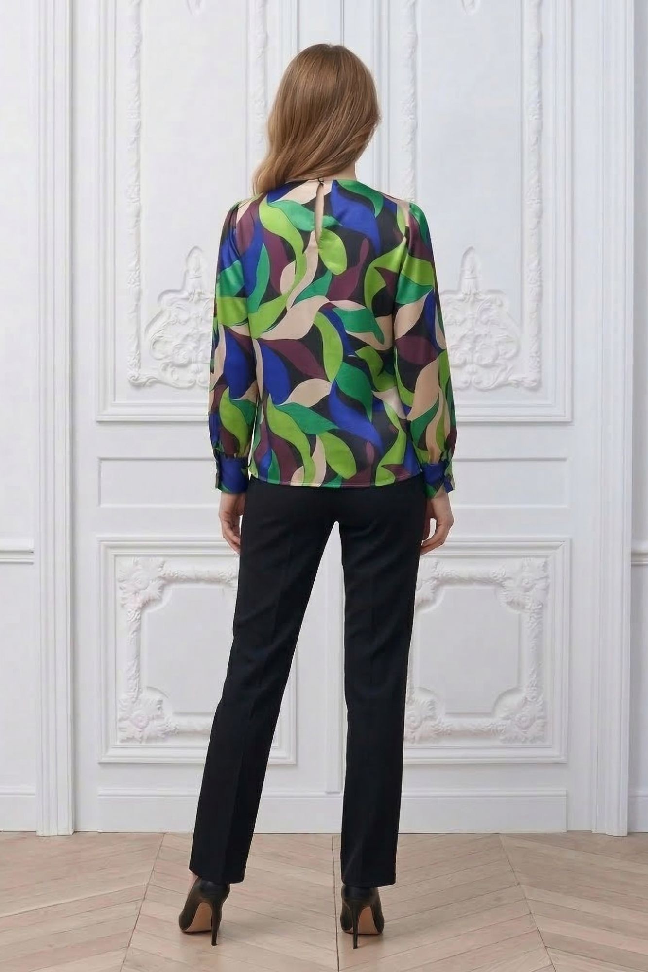 Bluzka zachwyca dużym, wzorem w intensywnych odcieniach zieleni, bordo, beżu i fioletu, które harmonijnie przenikają się na powierzchni tkaniny, tworząc efektowną, a jednocześnie wysmakowaną kompozycję kolorystyczną. Wykonana z miękkiej, wiskozowej tkaniny o subtelnym, satynowym połysku, układa się lekko i płynnie, podkreślając elegancję prostego kroju.