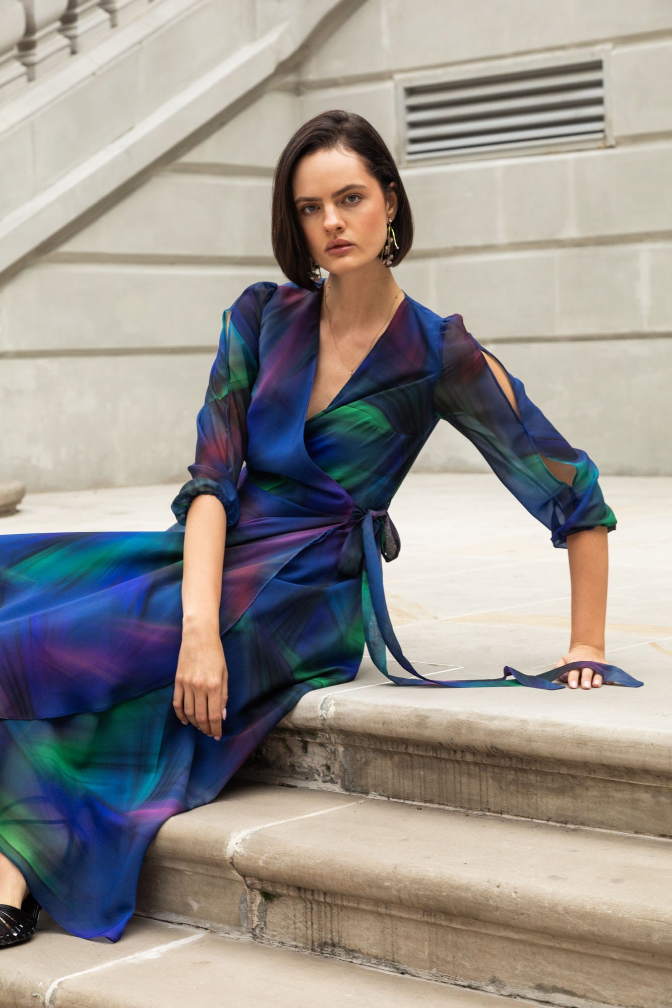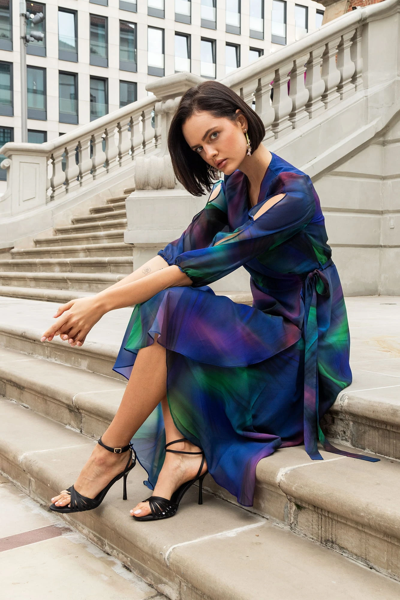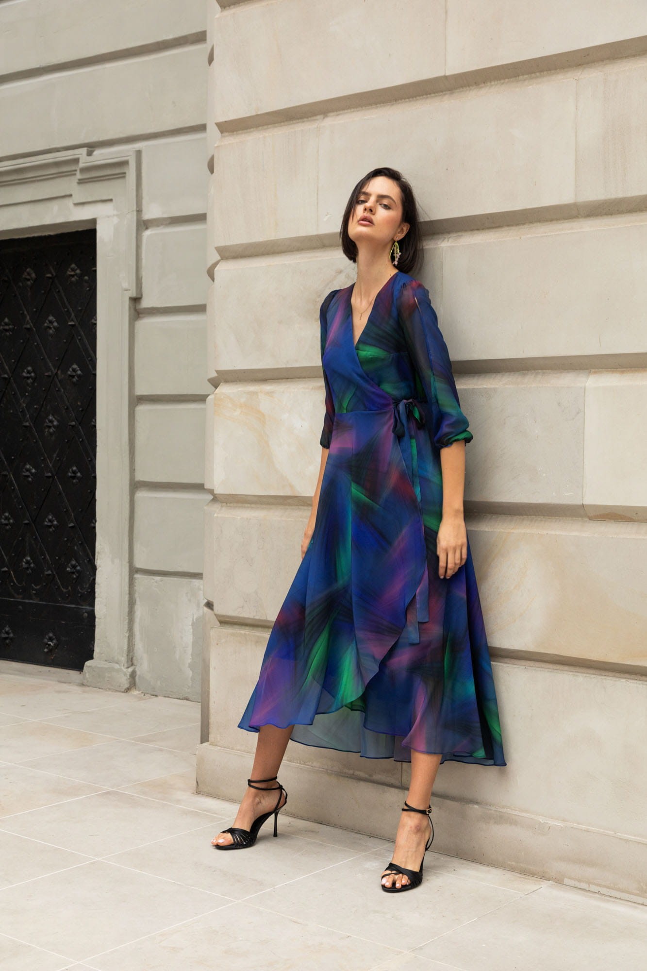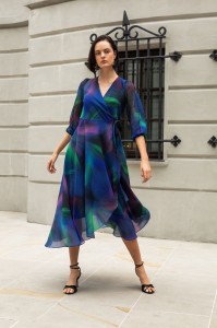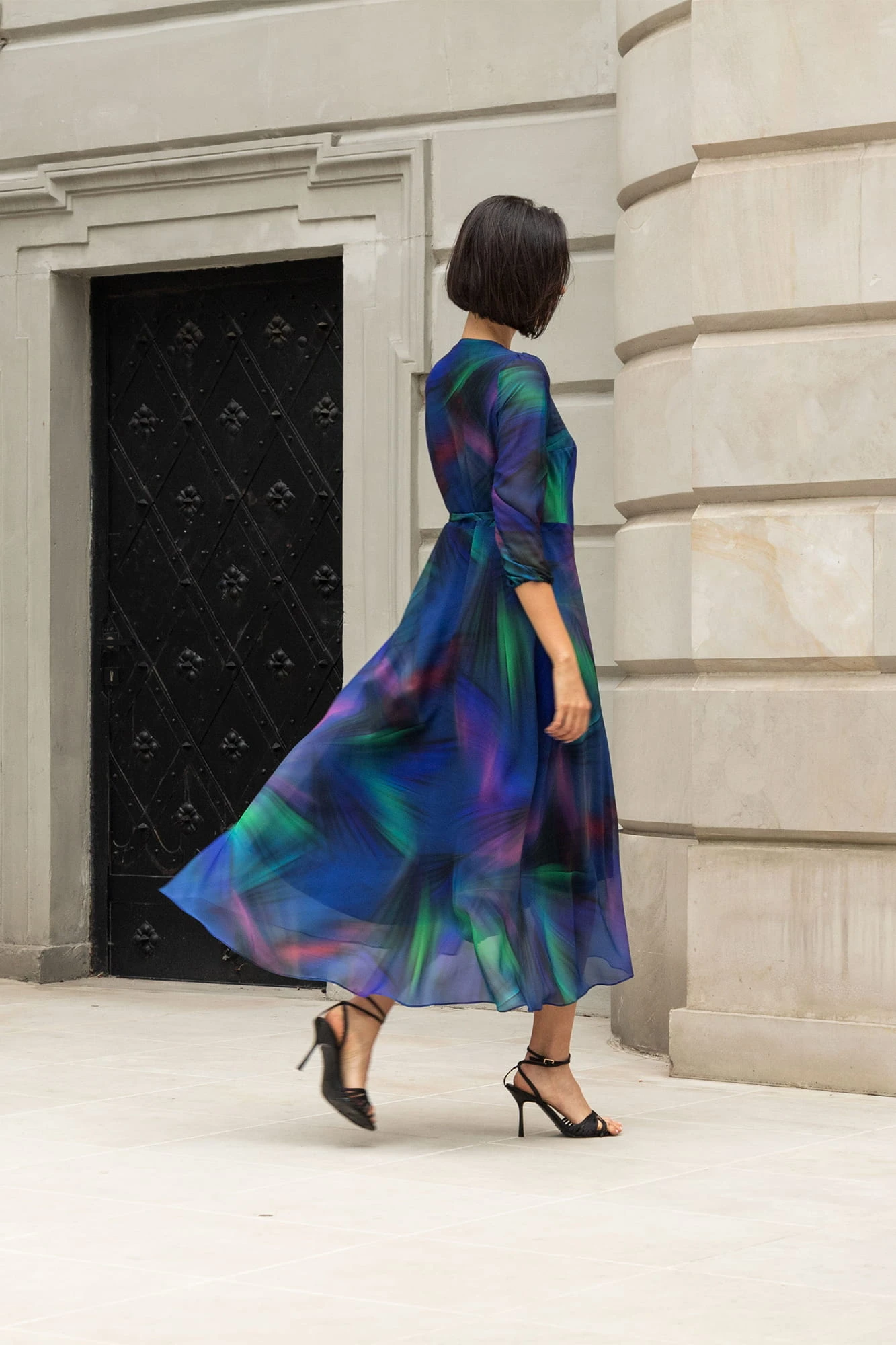 Elegancka rozkloszowana sukienka. Uszyta z tkaniny szyfonowej. Sukienka kopertowa z możliwością regulacji, szarfa wiązana z boku pozwala na swobodne dopasowanie sukni do sylwetki. Szyfonowe, lekko prześwitujące rękawy, o długości do łokcia z pęknięciami oraz rozkloszowana spódnica, nadają sukience lekkości i zwiewności. Dół jest lekko asymetryczny, ma delikatnie krótszy przód. Sukienka posiada dopasowaną kolorystycznie podszewkę.