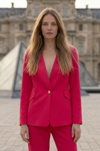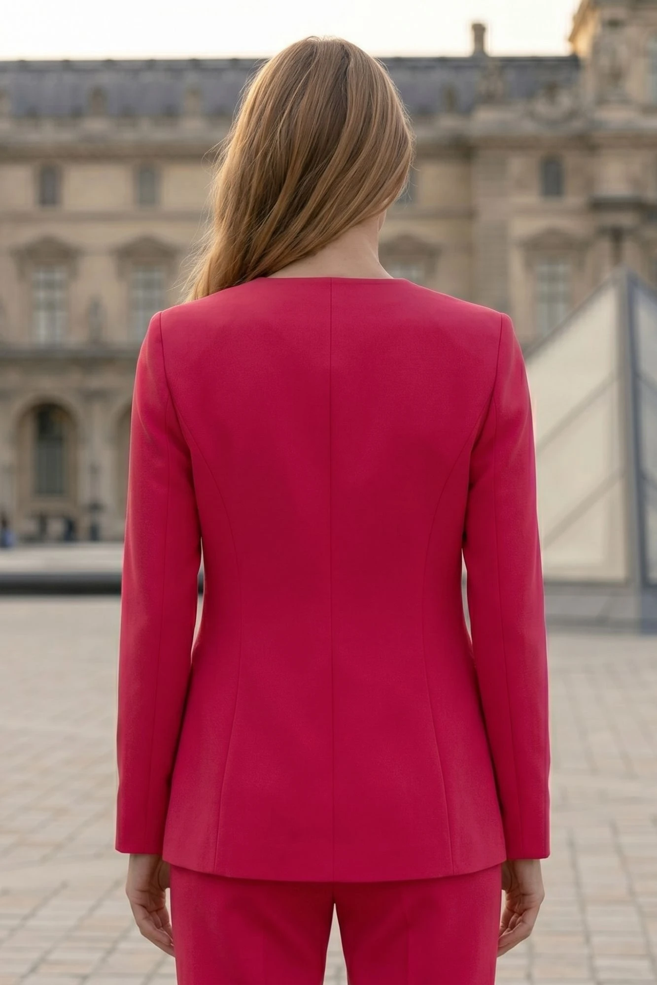 Dla uzyskania najbardziej spektakularnego efektu, marynarka została zaprojektowana do noszenia w zestawie. Do żakietu możesz dokupić spodnie(klik) z tego samego materiału i w tym samym kolorze. Razem tworzą energetyczny, monochromatyczny garnitur damski, który jest jednym z najgorętszych trendów sezonu