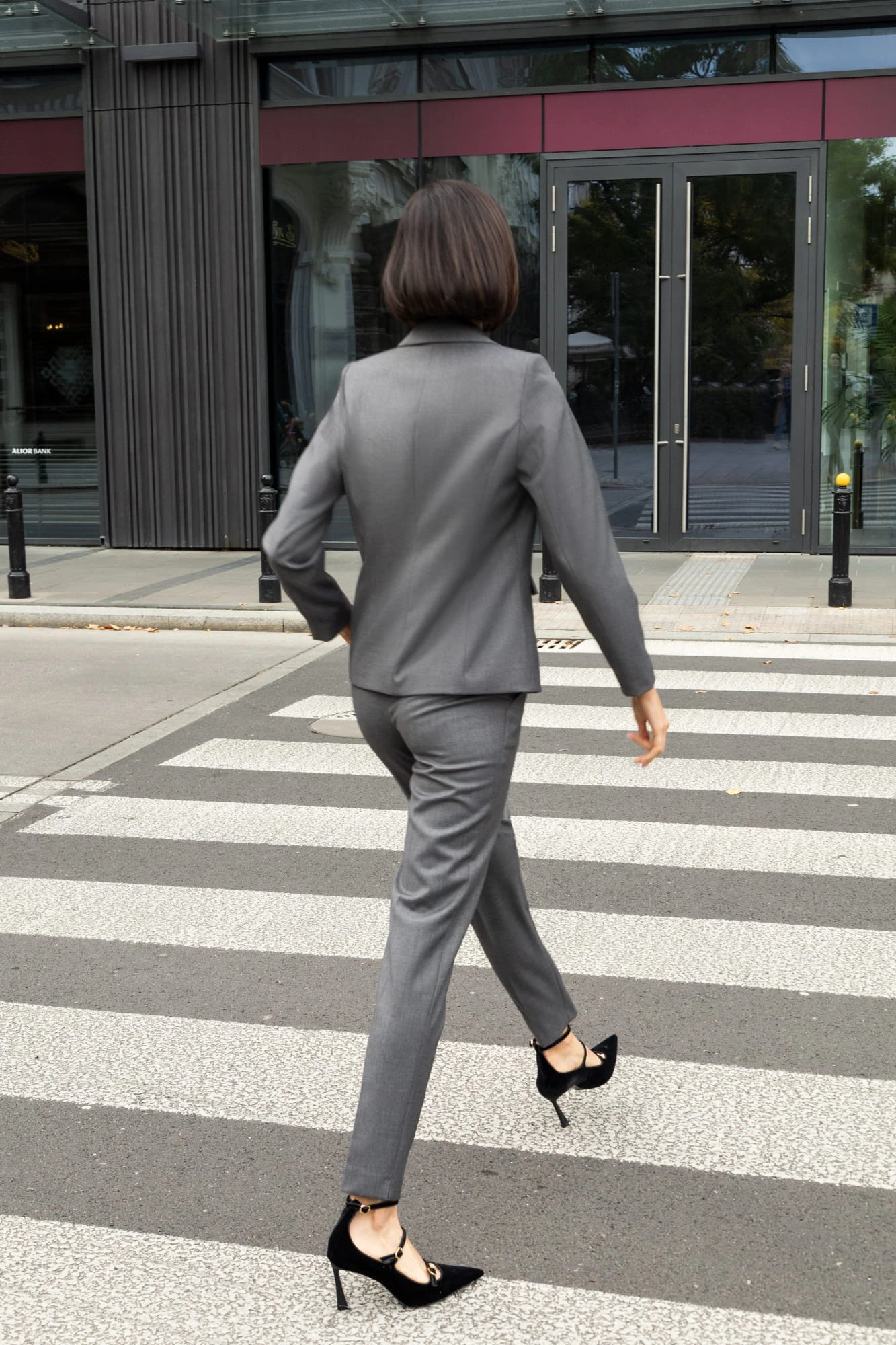 Klasyczny żakiet w kolorze szarym. Uszyty z doskonale układającej się na sylwetce tkaniny, łączącej w sobie najlepsze właściwości włókien naturalnych i syntetycznych. Żakiet jest lekko dopasowany w talii wysokimi zaszewkami modelującymi, umiejscowionymi z przodu i z tyłu. Na przodzie klasyczne wyłogi oraz wpuszczane kieszenie z patkami. Zapinany na jeden guzik.