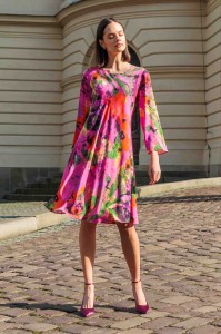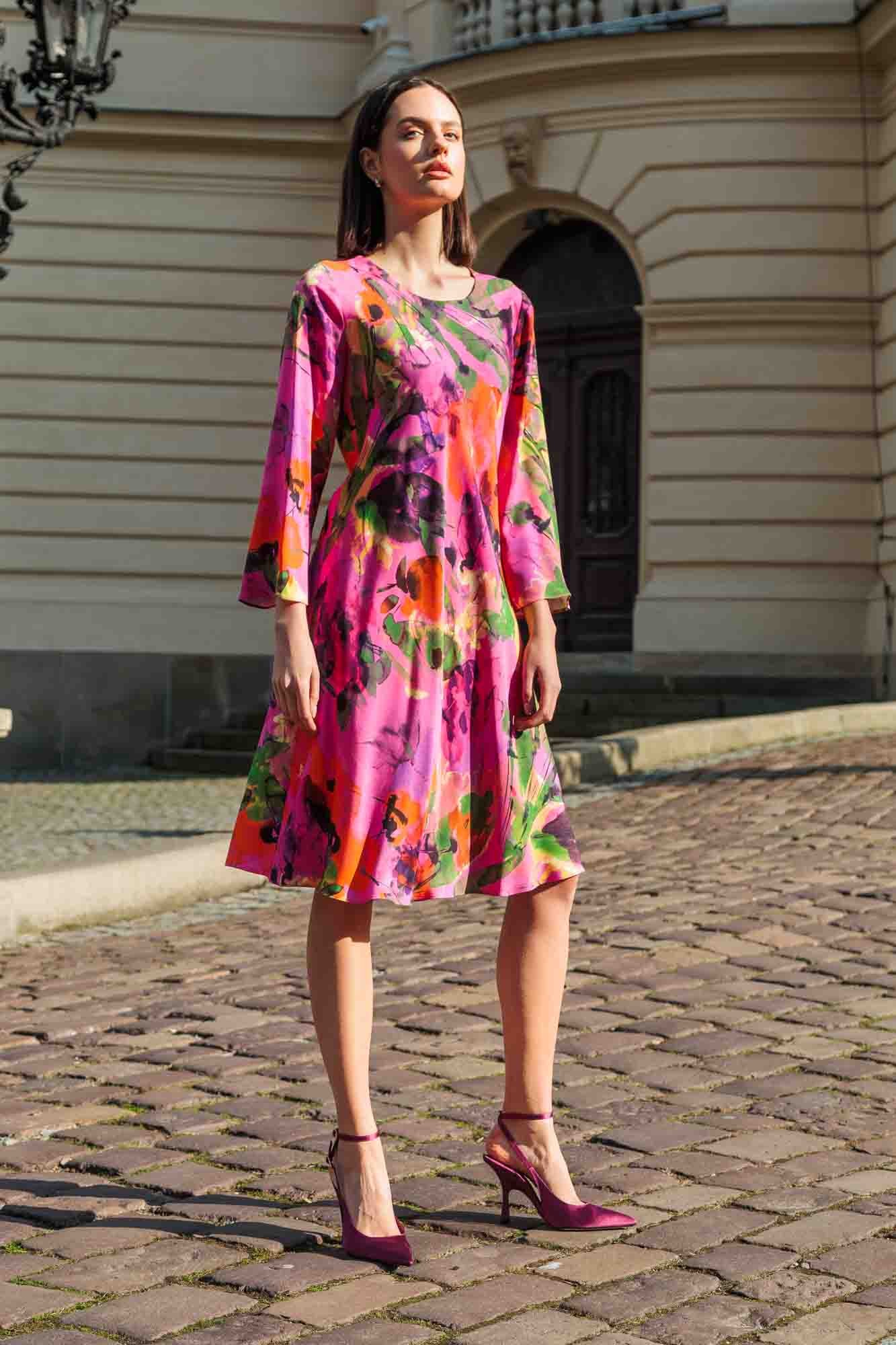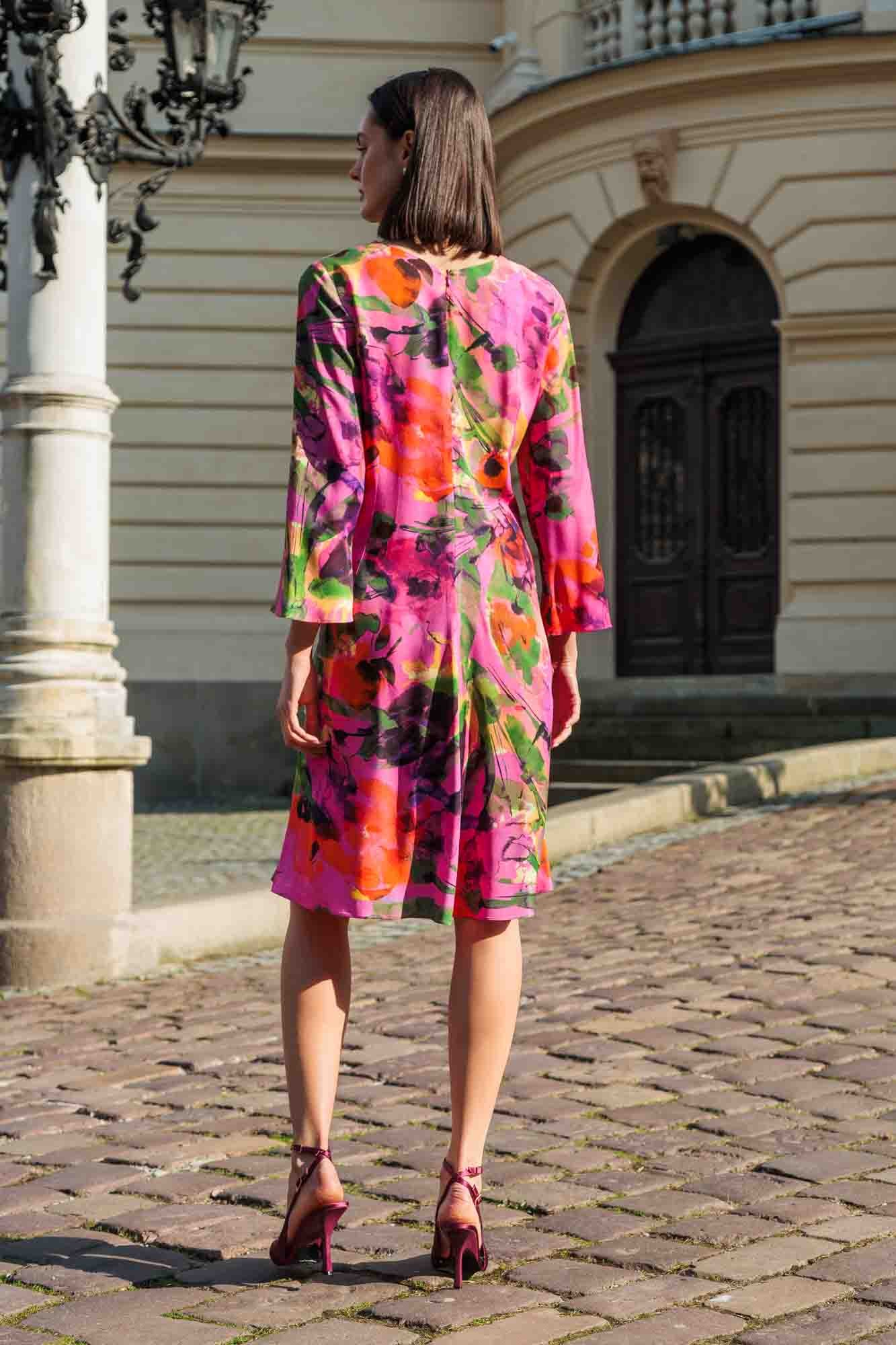 Kolorowa sukienka z rozszerzanym rękawem