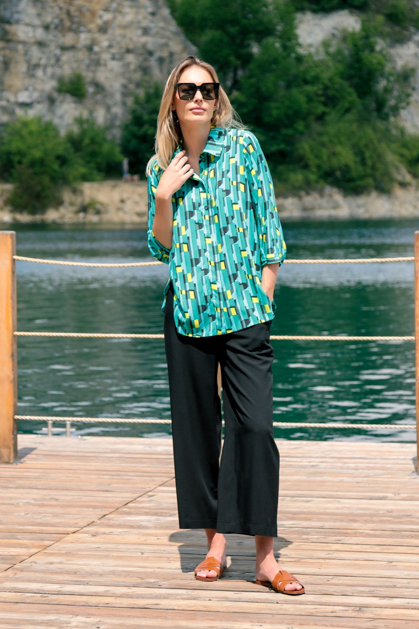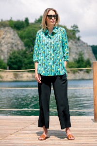 Koszulowa bluzka w intensywny, geometryczny wzór. Uszyta z bardzo komfortowej tkaniny wiskozowej. Rozpinana na całej długości. Część małych, czarnych guzików została ukryta pod listwą, a część jest widoczna. Rękawy o długości 3/4 zakończone zostały wąskimi mankietami zapinanymi na jeden guzik. Na plecach wszyty karczek, poniżej którego znajduje się, podkreślająca luźny fason bluzki, kontrafałda. Dół jest zaokrąglony, krótszy z przodu, a nieco dłuższy z tyłu.