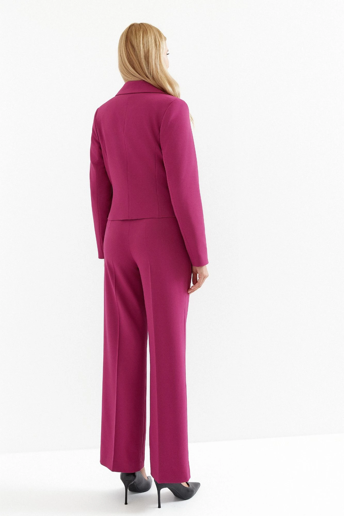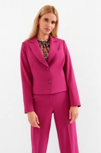 Krótki żakiet z wyłogami w kolorze fuksji. Ten wyjątkowy żakiet to kwintesencja nowoczesnej elegancji z nutą wyrazistego stylu. Wykonany z wysokiej jakości tkaniny w intensywnym odcieniu fuksji, przyciąga wzrok i dodaje charakteru każdej stylizacji. Krótki fason z klasycznymi wyłogami pięknie podkreśla linię ramion, a zapięcie na dwa guziki nadaje całości szyku i struktury.