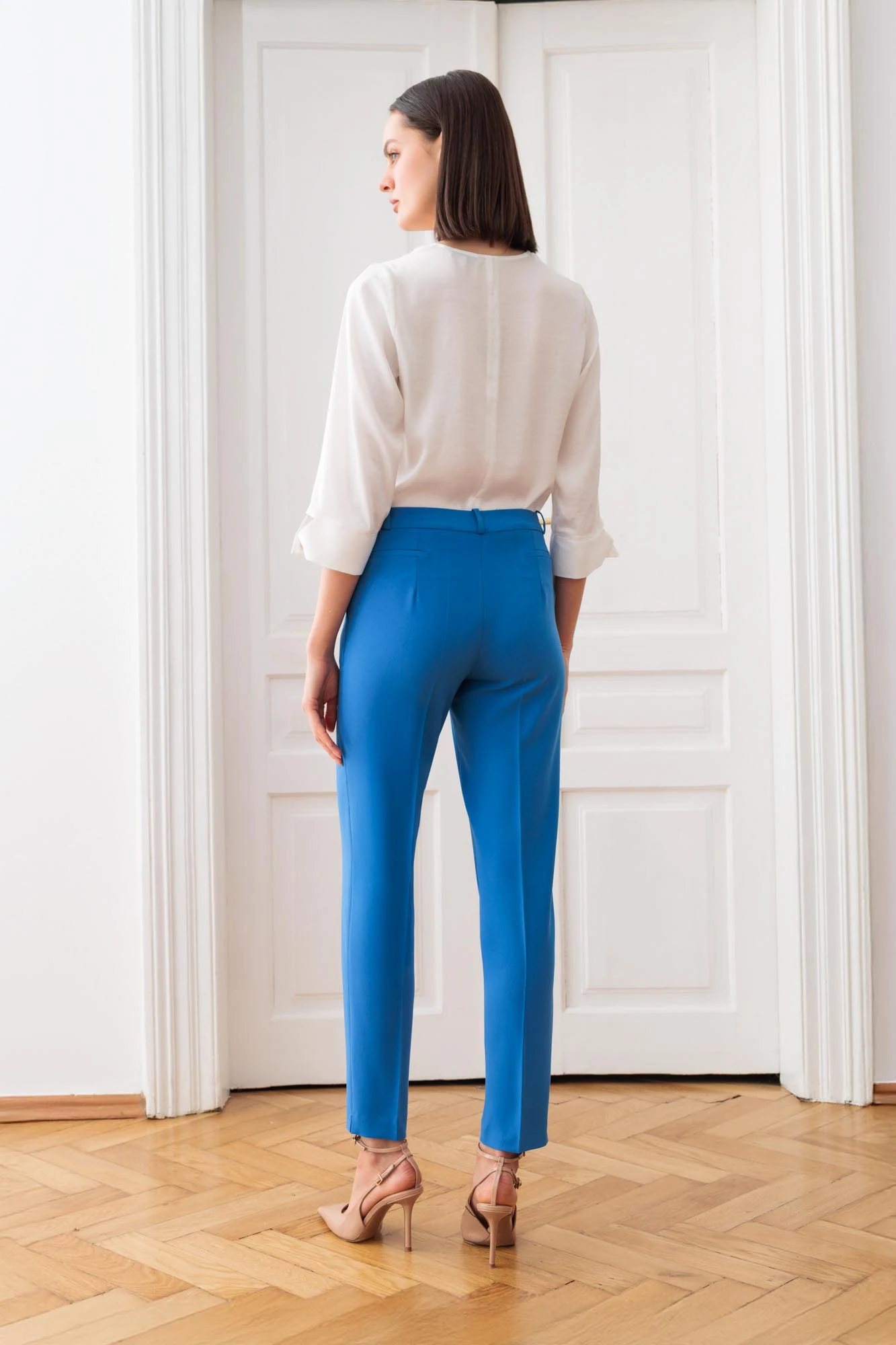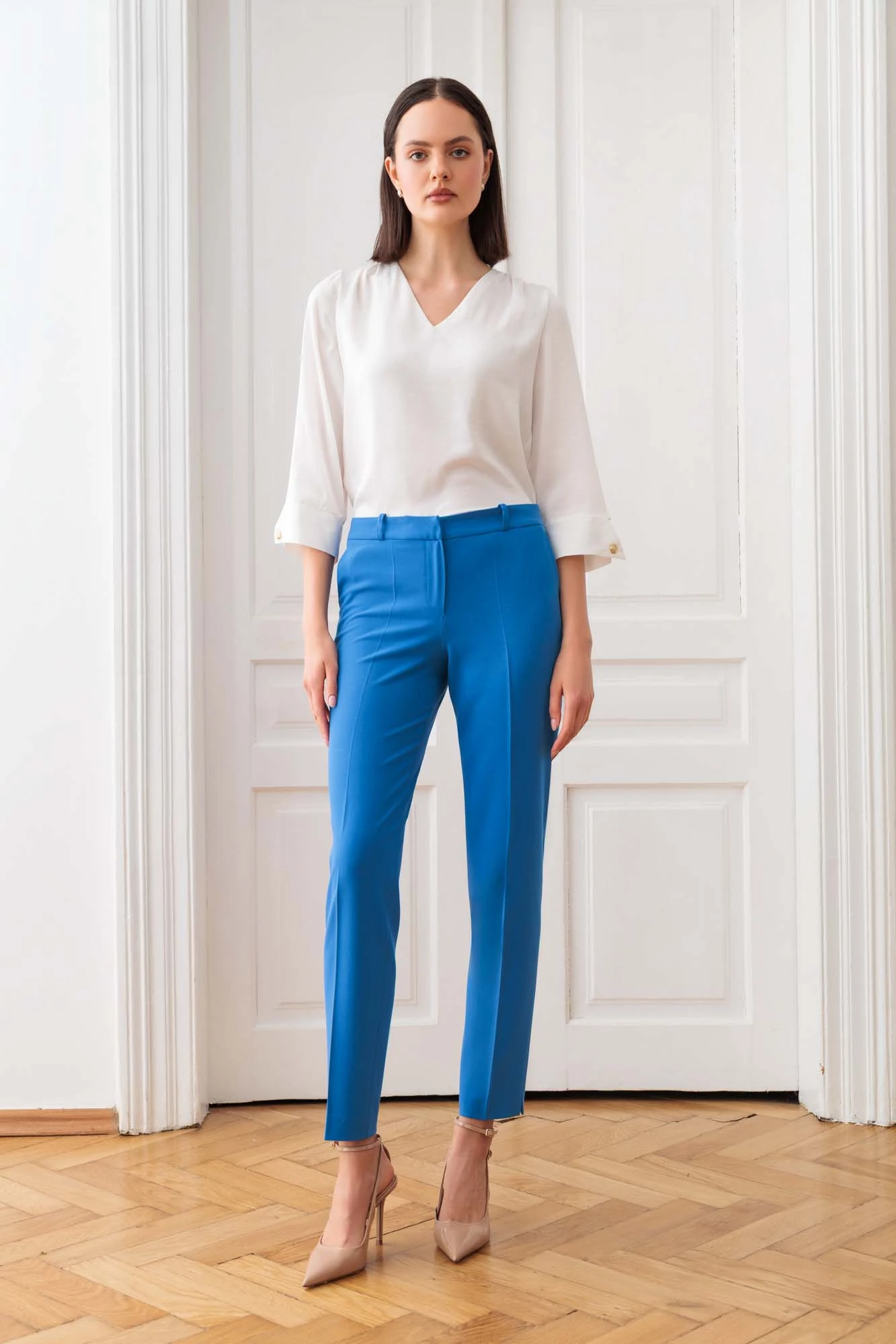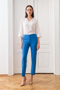 Niebieskie spodnie o eleganckim kroju oraz materiale z domieszką włókien wiskozowych zaprojektowane z myślą o podkreśleniu sylwetki i stylowym wyglądzie. Zwężane nogawki w kant zakończone subtelnym pęknięciem, dodają nowoczesnego akcentu i wysmuklają linię nóg. Zapinane są na dyskretny kryty zamek w pasującym, niebieskim odcieniu, który zachowuje estetykę całości. Spodnie posiadają wpuszczane kieszenie. Z tyłu odszyte zostały zaszewki doskonale dopasowujące ten model w talii oraz ramki imitujące kieszonki, zapewniając minimalistyczny i elegancki wygląd. Wszyty pasek z szlufkami dodaje funkcjonalności i pozwala na dopasowanie do ulubionych dodatków, takich jak paski czy ozdobne akcesoria.