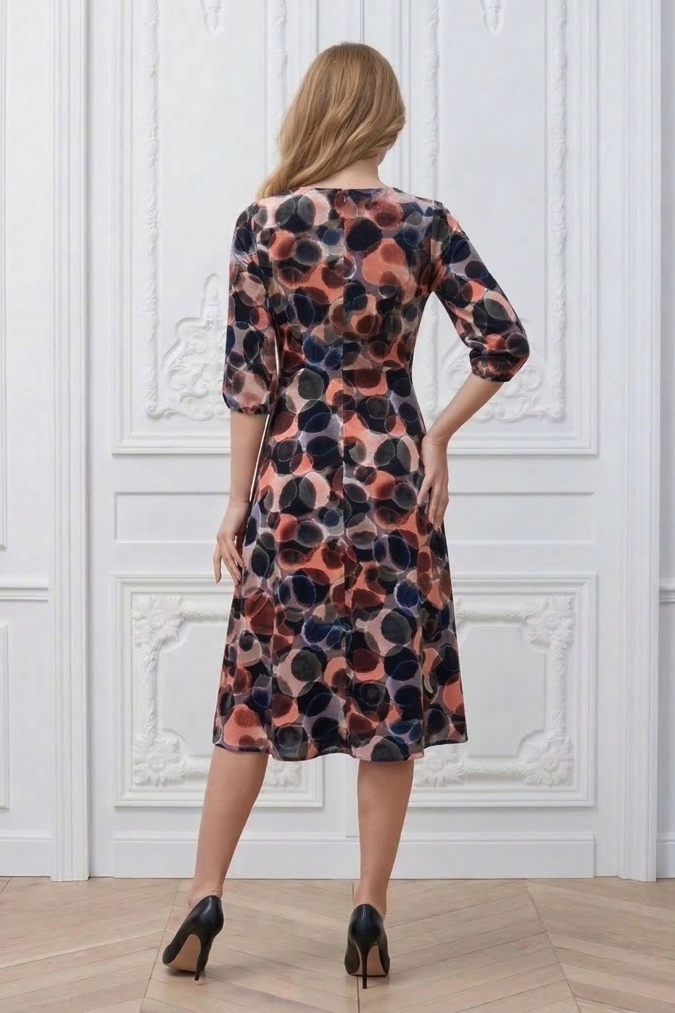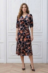 Sukienka rozkloszowana o długości za kolana, emanuje subtelną elegancją i wyrafinowanym stylem. Wykonana z wysokiej jakości wiskozowej tkaniny, pięknie układa się na sylwetce, podkreślając jej naturalne linie.
