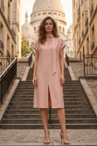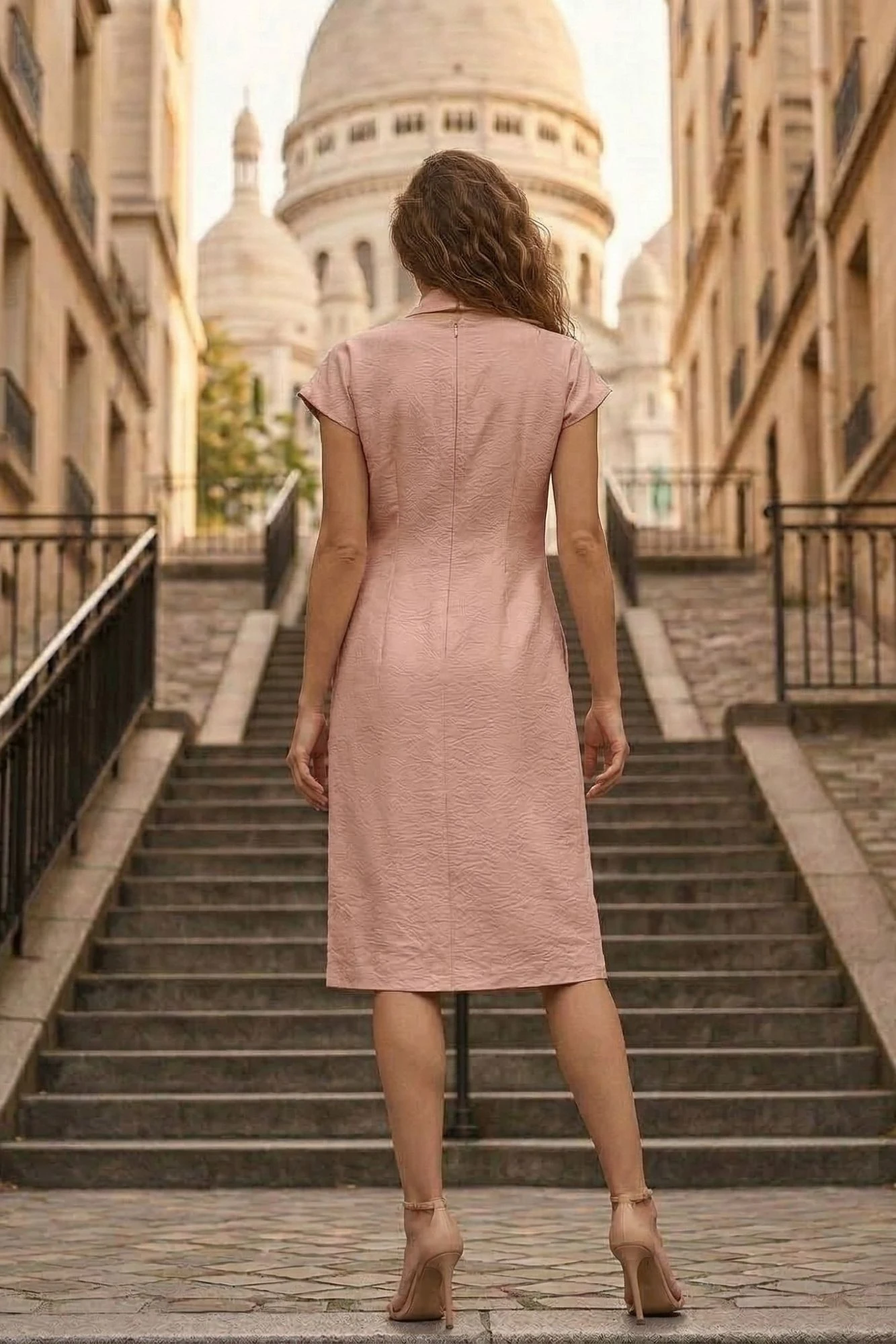 Elegancka różowa sukienka za kolana została uszyta z wysokiej jakości tkaniny o dużej zawartości wiskozy. To materiał, który pozwala skórze oddychać, jest niezwykle miękki w dotyku i pięknie układa się na sylwetce. Subtelna, tłoczona tekstura materiału dodaje całości luksusowego charakteru, sprawiając, że sukienka nie potrzebuje wielu dodatków, by zachwycać.