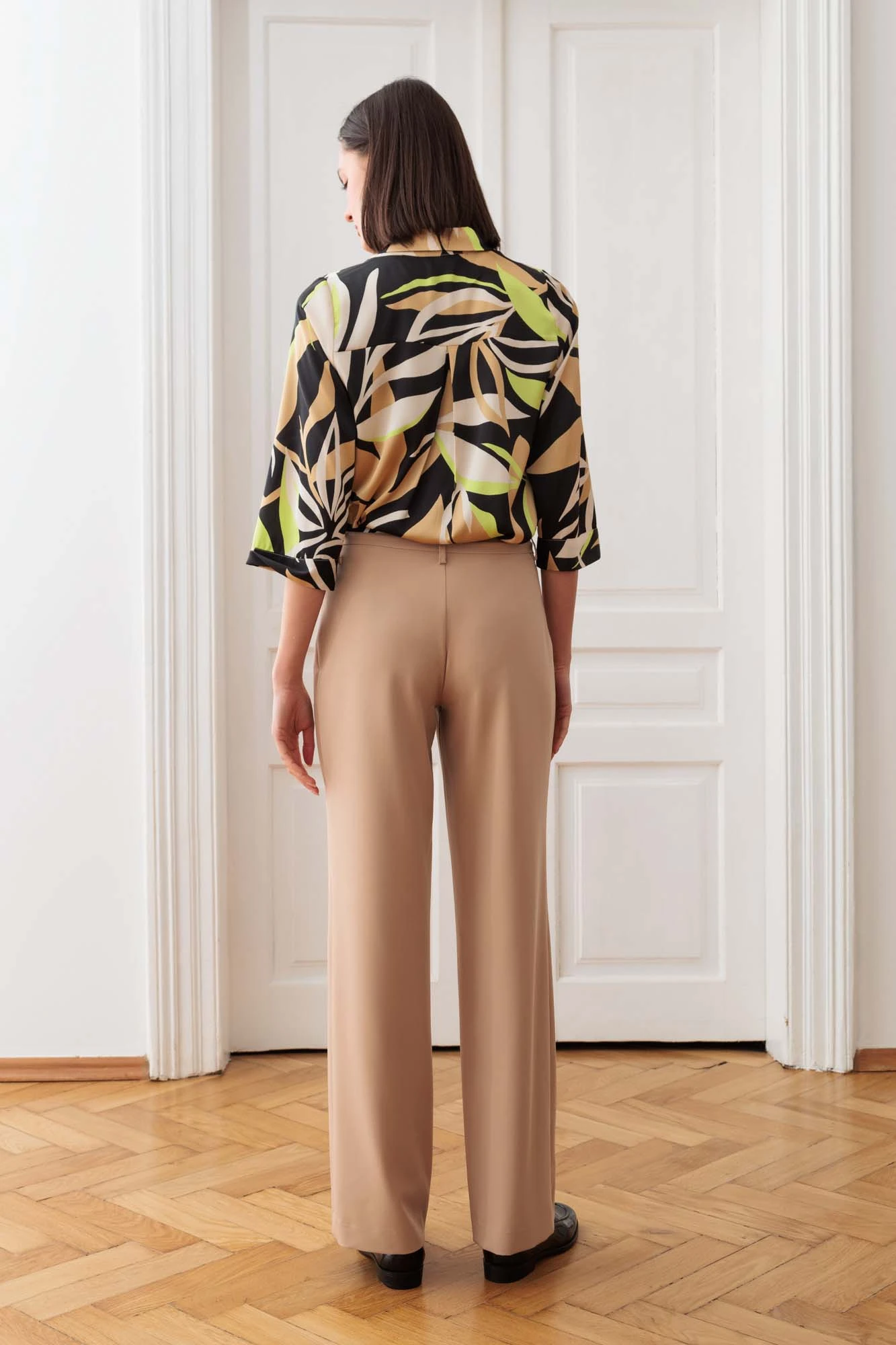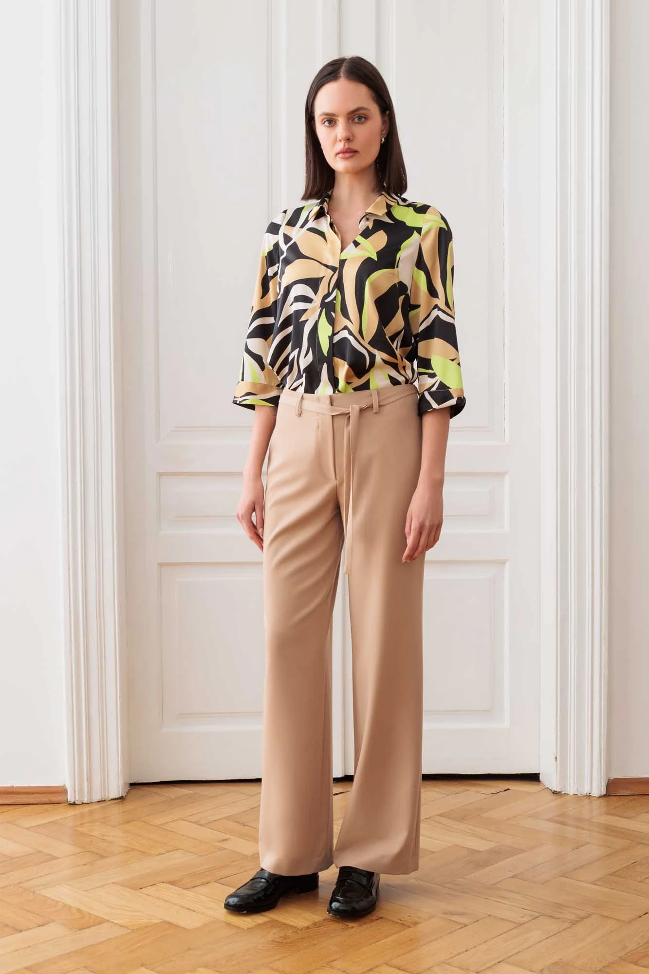 Szerokie beżowe spodnie z cienkim, materiałowym paskiem to idealne połączenie elegancji i wygody. Ich luźny krój zapewnia swobodę ruchów, a stonowany beżowy kolor dodaje stylu i wyrafinowania. Cienki, materiałowy pasek subtelnie podkreśla talię, wprowadzając delikatny akcent, który uzupełnia całość. Gładka tkanina z domieszką włókien wiskozowych, doskonale układa się na sylwetce i zapewnia komfort noszenia. Spodnie zapinane są z przodu na kryty suwak oraz haftkę.