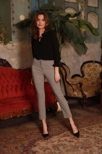 Spodnie w drobną, wyrazistą kratkę. Uszyte z miękkiej, przyjemnej, elastycznej tkaniny, ładnie układającej się na sylwetce. Spodnie zapinane są z przodu na suwak oraz metalową haftkę. Dzięki szerokiej gumie wszytej w talii, po wewnętrznej stronie, spodnie nie wymagają noszenia paska. Z tyłu odszyte zostały pionowe zaszewki modelujące, dzięki którym spodnie są doskonale dopasowane oraz niewielkie rameczki imitujące kieszonki.
