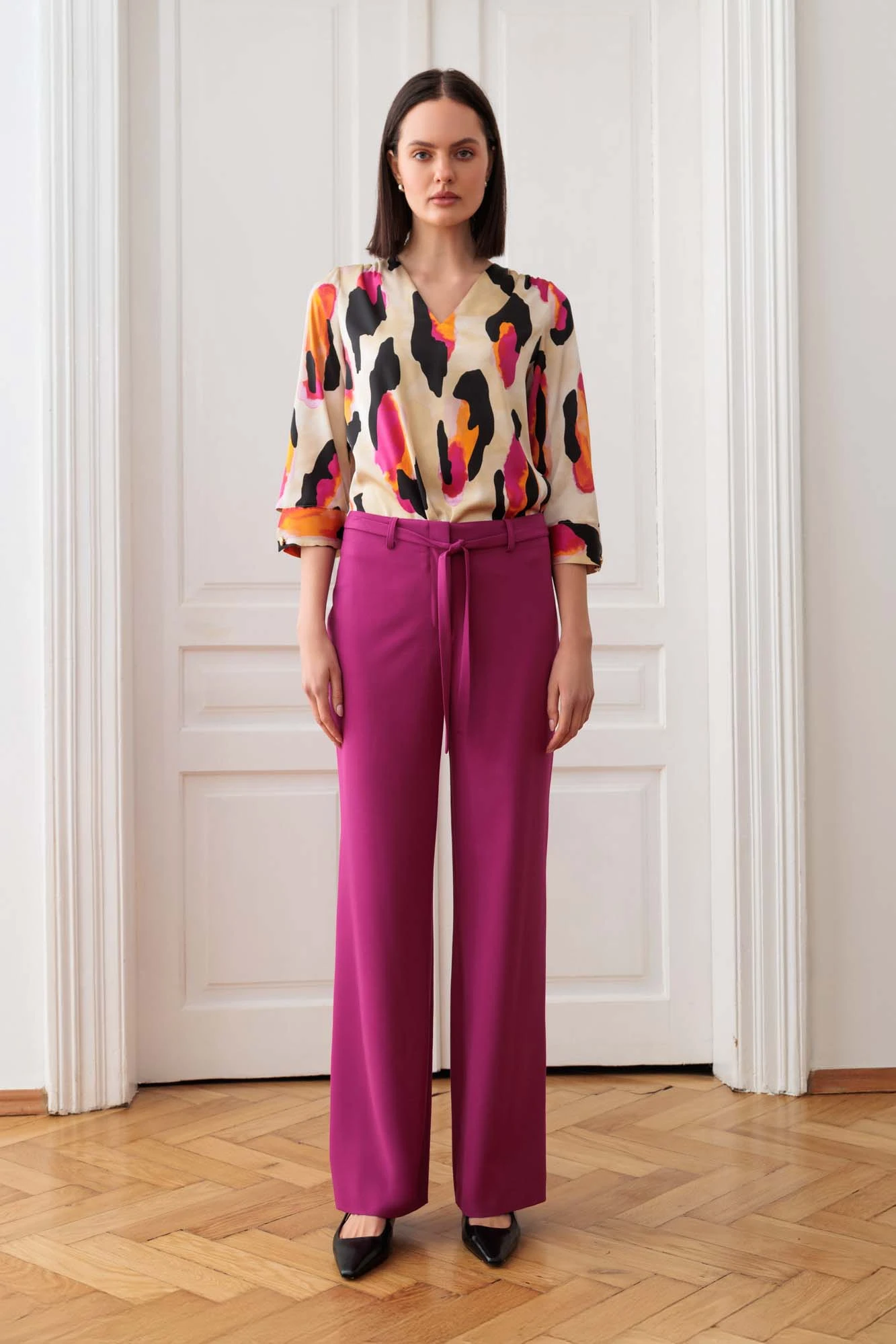 Szerokie spodnie z cienkim, materiałowym paskiem w energetycznym kolorze fuksji to idealne połączenie elegancji i wygody. Ich luźny krój zapewnia swobodę ruchów, a intensywny kolor dodaje stylu i wyrafinowania. Cienki, materiałowy pasek subtelnie podkreśla talię, wprowadzając delikatny akcent, który uzupełnia całość. Gładka tkanina z domieszką włókien wiskozowych, doskonale układa się na sylwetce i zapewnia komfort noszenia. Spodnie zapinane są z przodu na kryty suwak oraz haftkę.