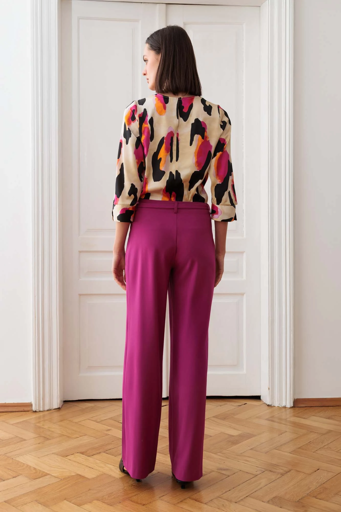 Spodnie te świetnie sprawdzą się zarówno na co dzień, jak i podczas bardziej formalnych okazji – wystarczy dobrać odpowiednią górę, np. klasyczny żakiet uszyty z tej samej tkaniny w pasującym kolorze (klik) oraz dodatki. W codziennych stylizacjach z tym modelem spodni sprawdzi się np. jednobarwna bluzka, w neutralnych kolorach, co nada całości spójności i harmonii oraz buty na płaskiej podeszwie, a dopełnieniem całości będzie delikatna biżuteria, np. w złotym kolorze