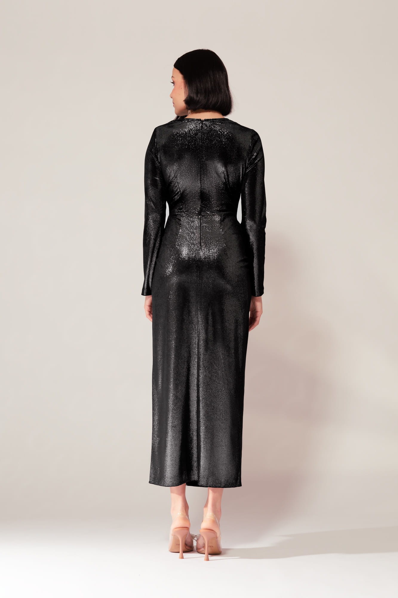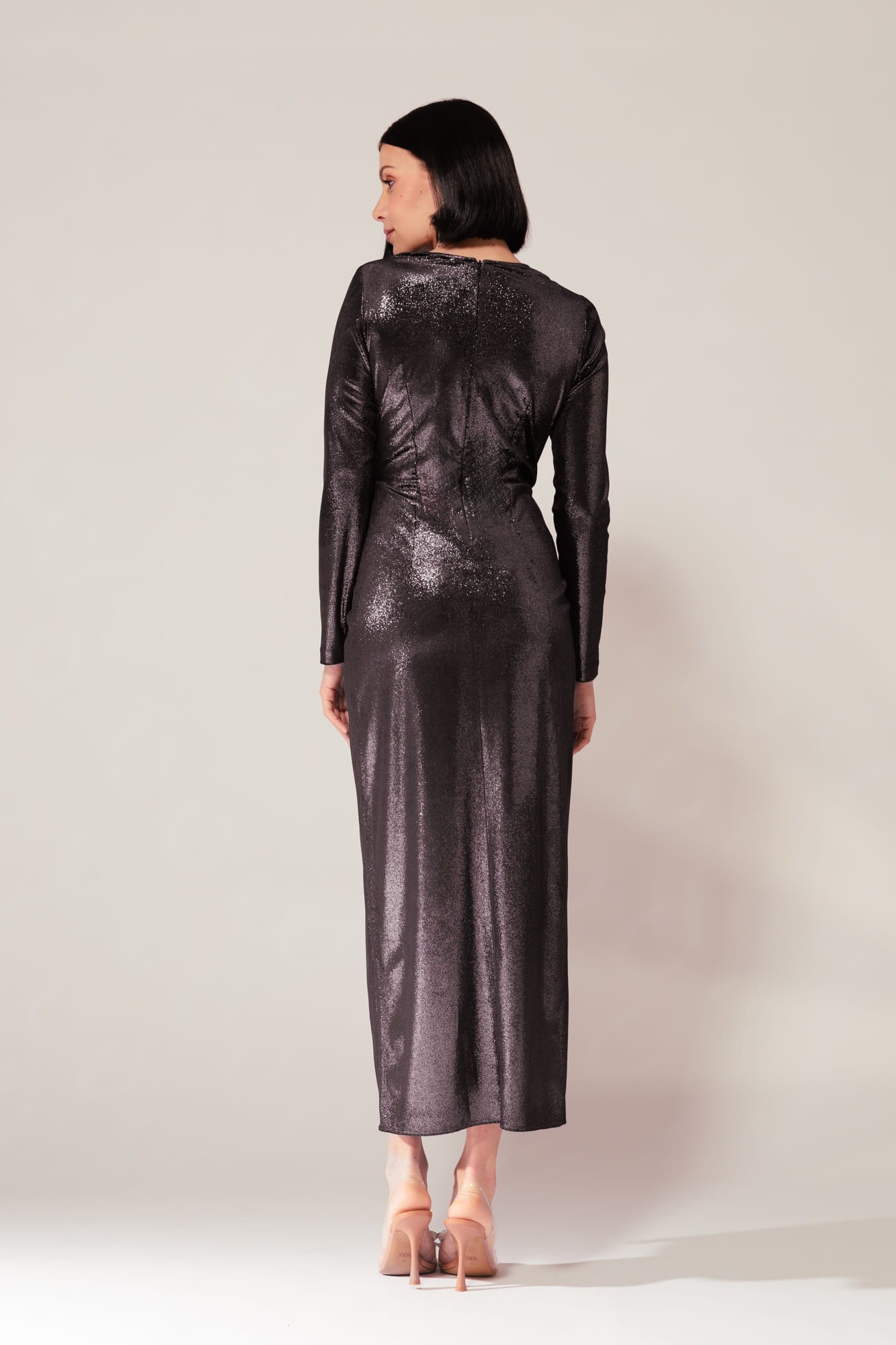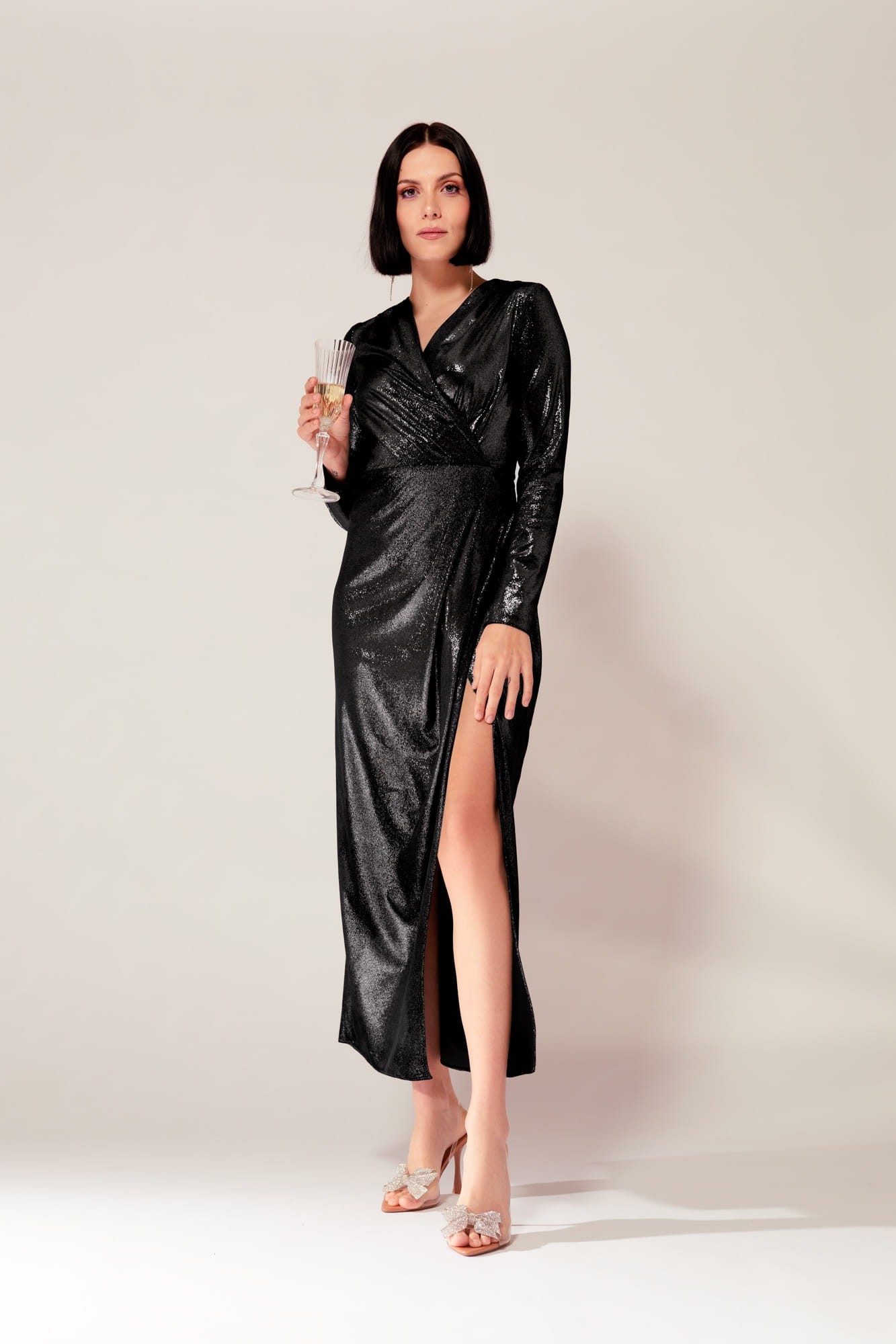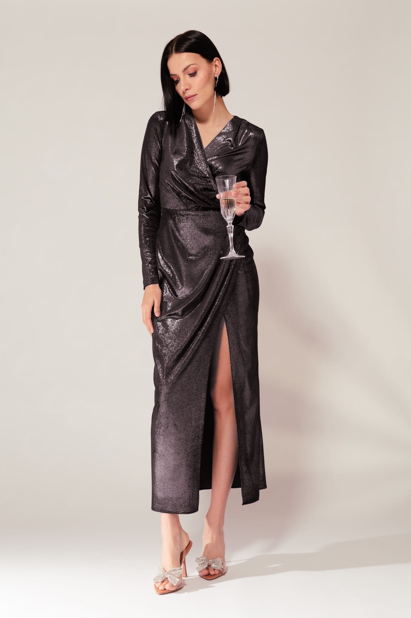 Długa sukienka ze srebrnym połyskiem. Tkanina, z której została uszyta doskonale układa się na sylwetce. Kopertowy dekolt wysmukla szyję i efektownie podkreśla biust. Dół sukienki również został tak zaprojektowany aby podkreślał kobiece atuty: odcięcie w talii - ładnie ją zaznacza. Zwężana do dołu spódnica z wysokim rozporkiem po lewej stronie, pięknie eksponuje nogi. Rękawy są długie i dopasowane. Sukienka jest zapinana z tyłu na kryty suwak.