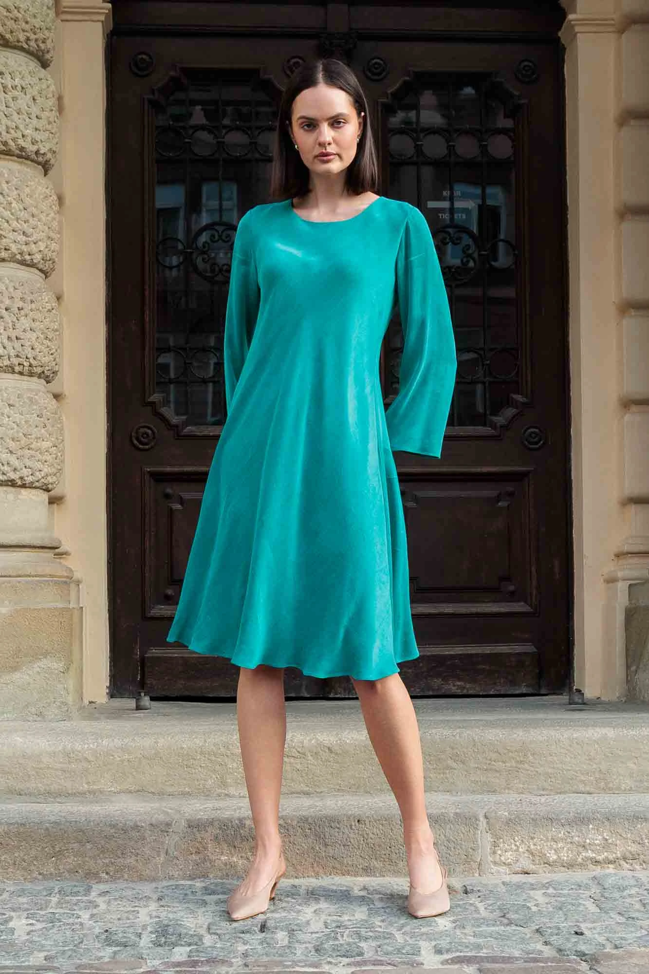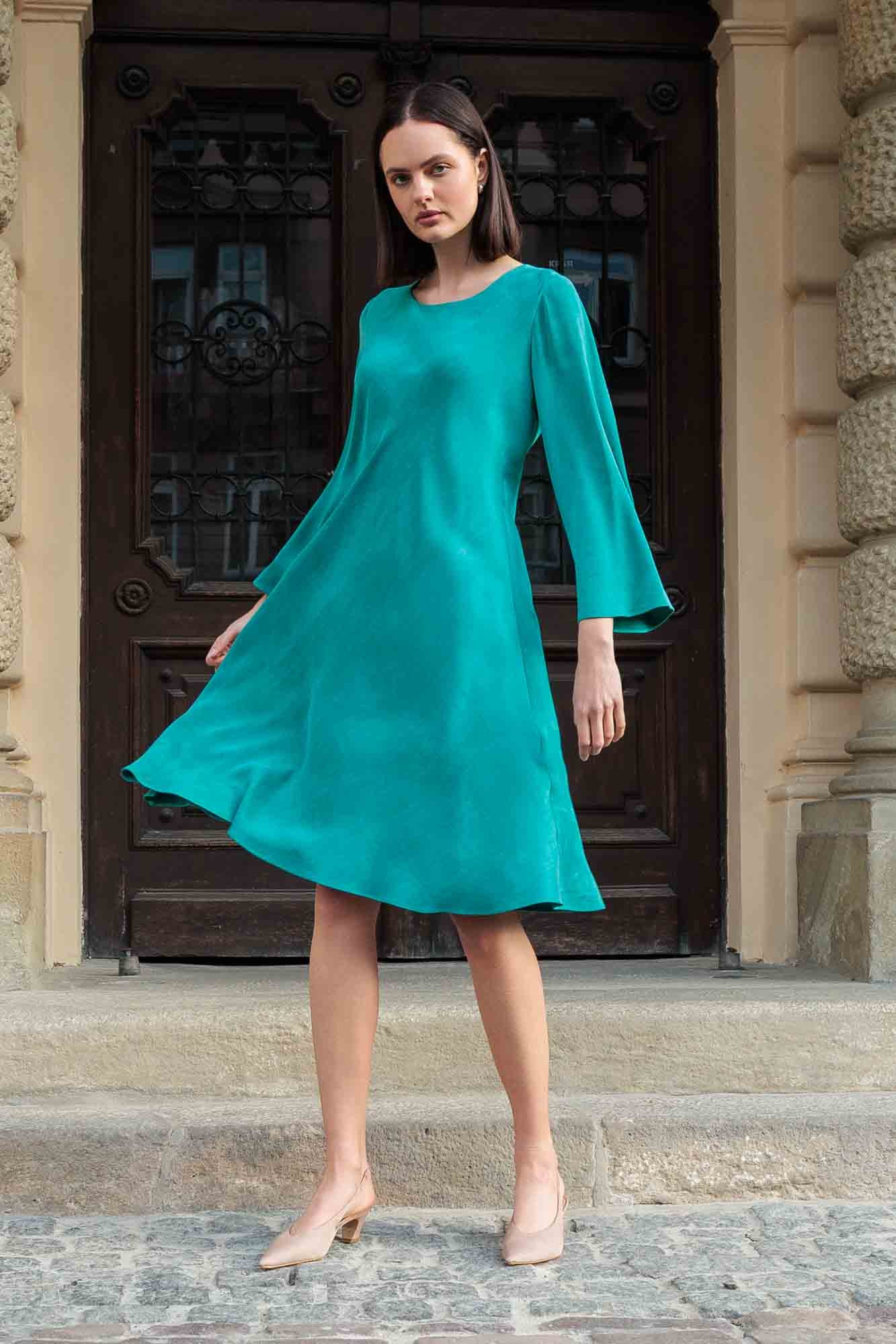 Sukienka w kolorze szmaragdowym za kolano to kwintesencja subtelnej elegancji. Okrągły dekolt nadaje jej klasyczny, ponadczasowy charakter, idealnie podkreślając szyję. Zapięcie z tyłu na kryty zamek zapewnia wygodę i estetykę, pozostając niemal niewidocznym, dzięki czemu całość wygląda niezwykle schludnie. Sukienkę wyróżnia przód z ukosa ciętej tkaniny, co dodaje kreacji intrygującego, nowoczesnego wyrazu, jednocześnie podkreślając sylwetkę w sposób dyskretny, ale efektowny.