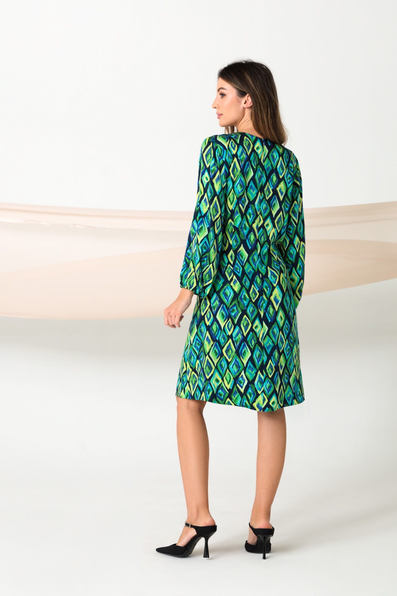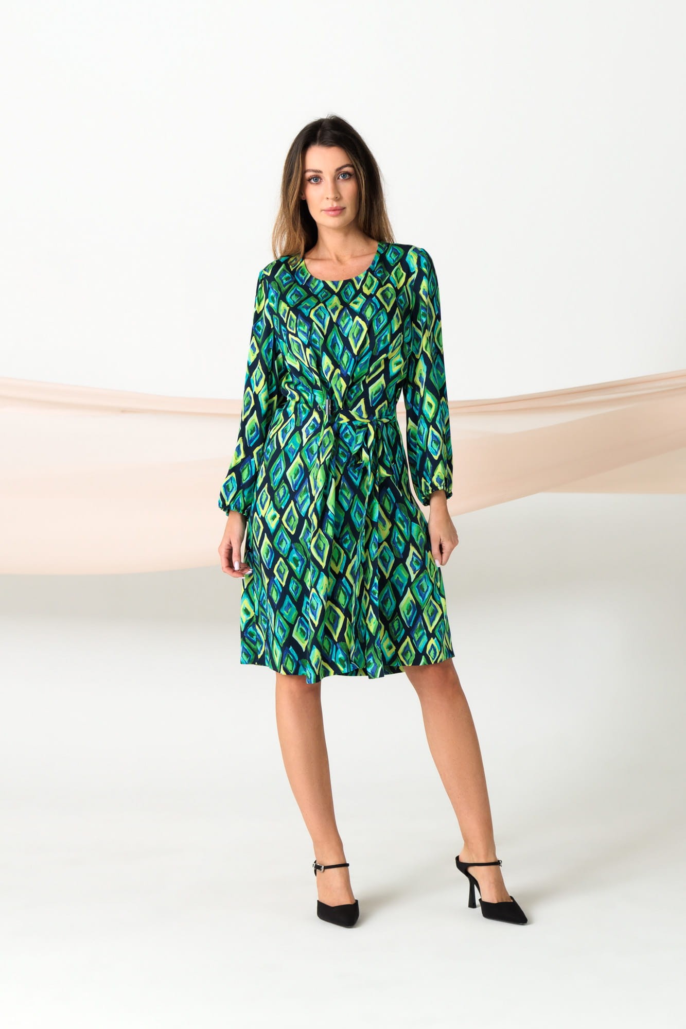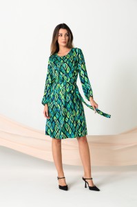 Wiskozowa sukienka w geometryczny wzór, w odcieniach zieleni. Rękawy są długości 7/8 zakończone delikatną, nieuciskającą gumką. Dekolt nieduży, okrągły. Lekko rozszerzany krój sukienki doskonale prezentuje się na paniach o kobiecych kształtach. Ciekawą ozdobą tego modelu jest wiązanie, które również pomaga lekko dopasować sukienkę w talii. Sukienka zapinana jest z tyłu na kryty suwak.