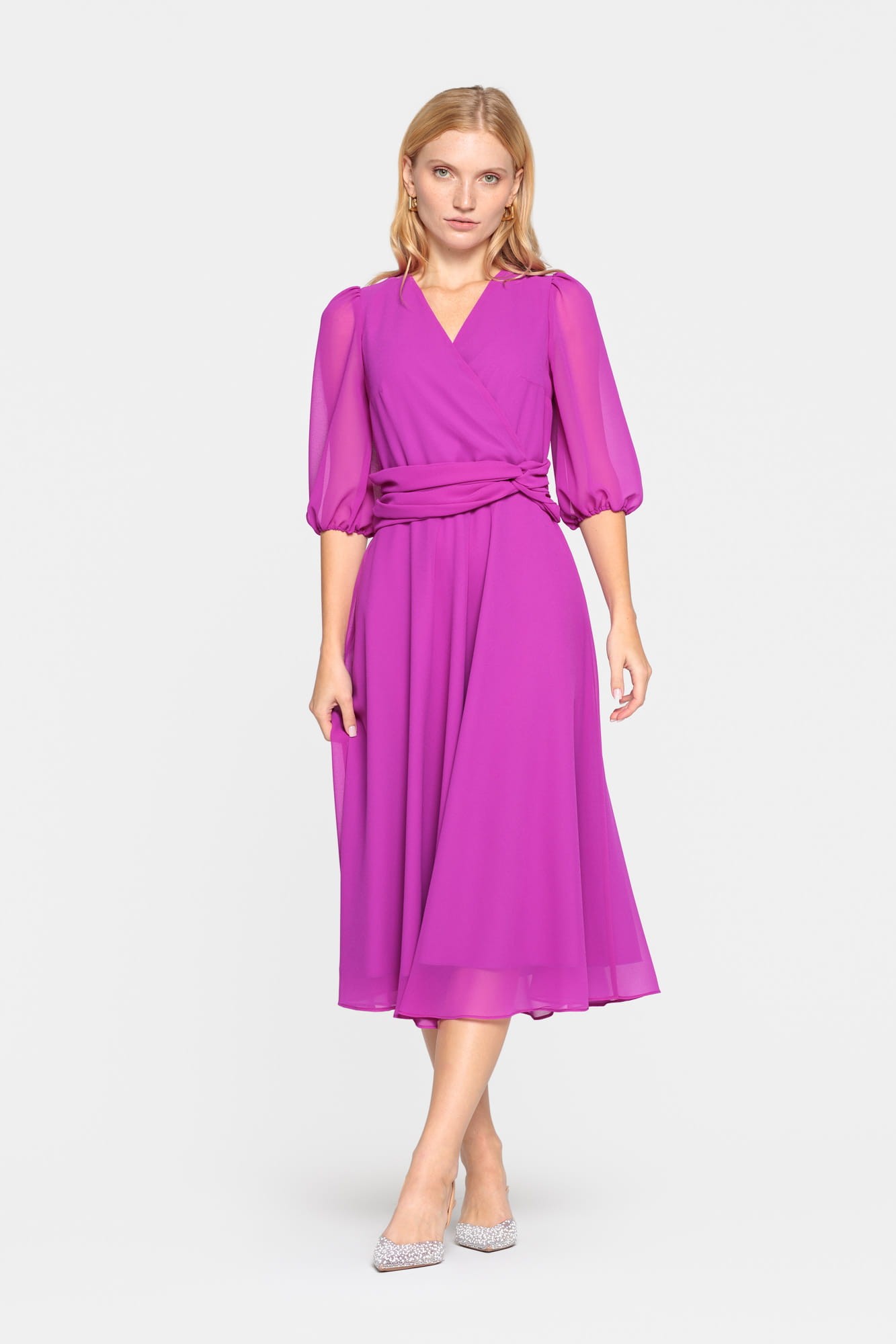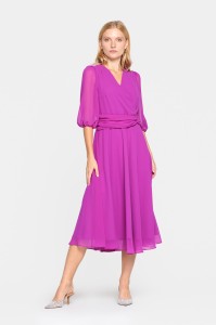 Sukienka w odcieniu fuksji w połączeniu z eleganckim krojem sprawi, że będziesz czuć się w niej wyjątkowo. W zestawieniu ze szpilki sprawdzi się na wiele okazji np. wesela