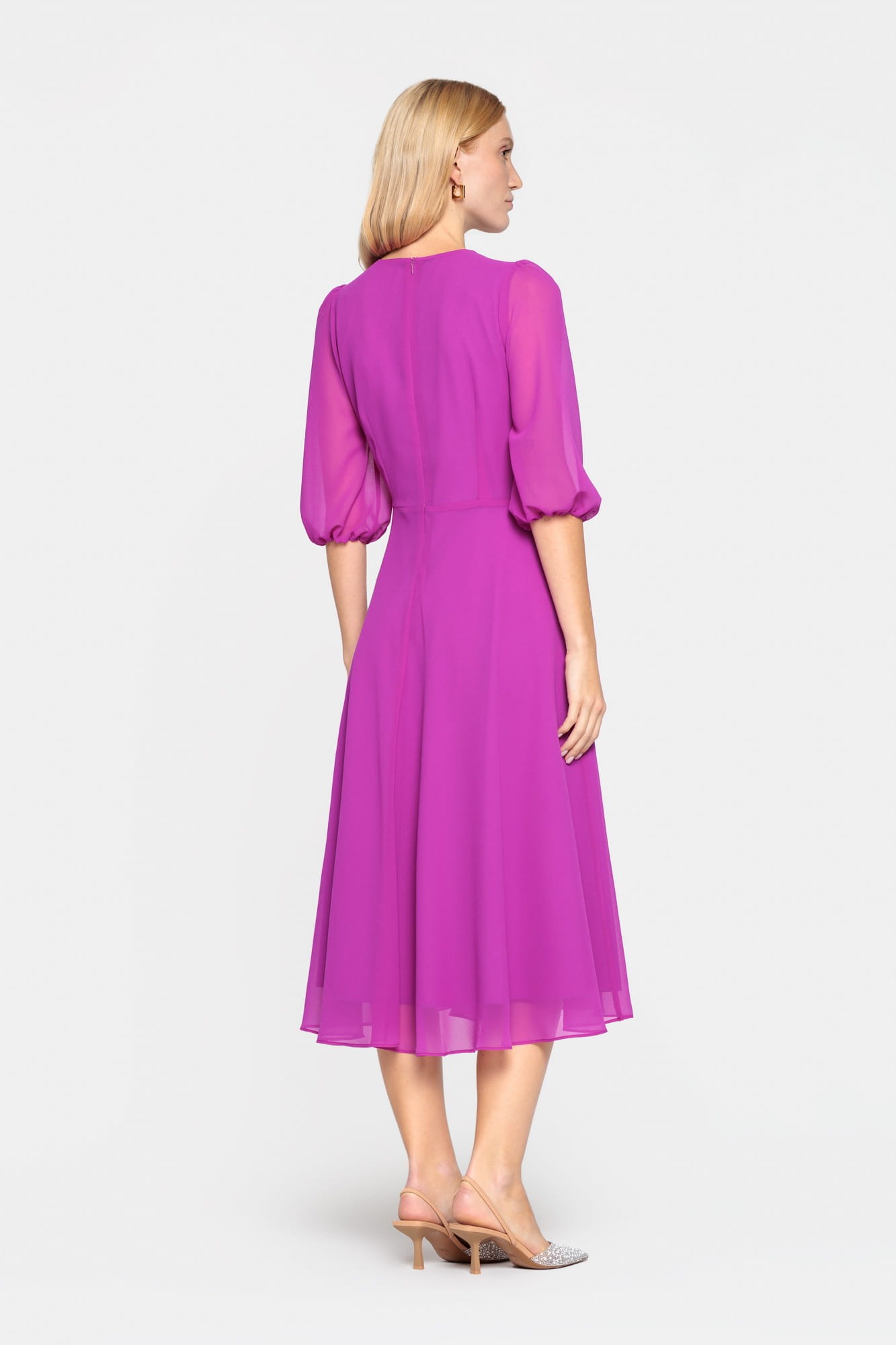 Wizytowa sukienka w wyjątkowym kolorze. Uszyta została z delikatnej tkaniny żorżetowej. Kopertowy dekolt oraz odcięcie w talii ozdobione efektownym drapowaniem, doskonale podkreślają kobiecą sylwetkę. Rękawy o długości 3/4 są lekko zmarszczone na ramionach, zakończone delikatną gumką. Rozkloszowana spódnica płynnie faluje przy każdym ruchu. Sukienka zapinana na plecach na kryty suwak. Sukienka posiada podszewkę. Aby wyeksponować zwiewność i lekkość sukienki, nie powinna ona być dopasowana lecz swobodnie opływać sylwetkę.