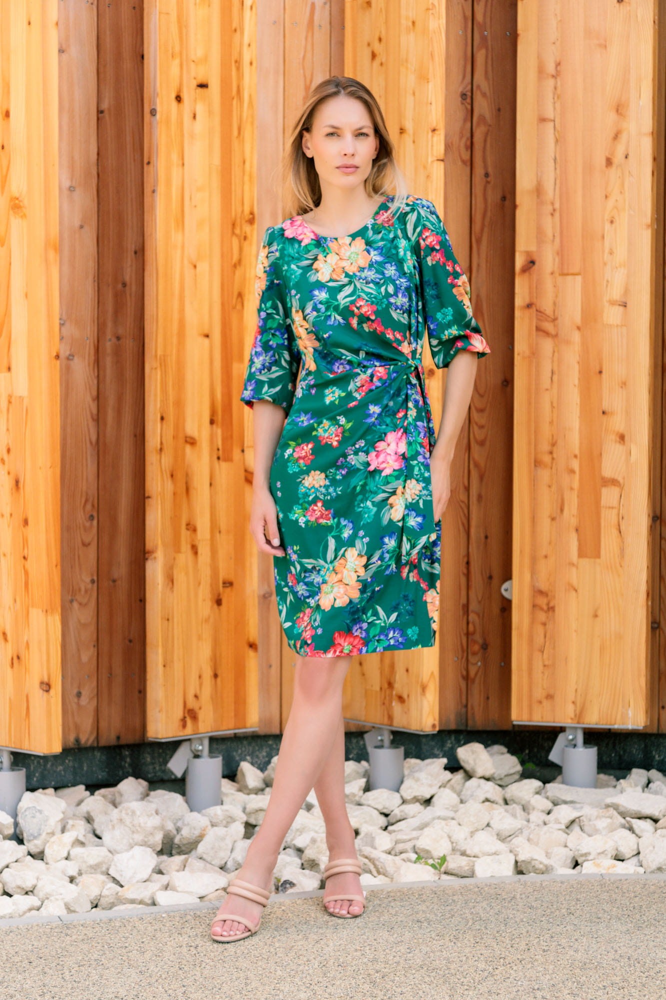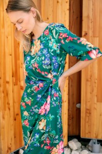 Zielona sukienka, o klasycznym kroju z motywem kolorowych kwiatów. Uszyta z komfortowej w noszeniu tkaniny wiskozowej (rayon). Rękawy są długości 3/4, z subtelnym marszczeniem, tworzącym niewielką bufkę na ramieniu, zakończone delikatną, nieuciskającą gumką. Dekolt nieduży, okrągły. Sukienka, dzięki odcięciu w talii oraz zmyślnemu przymarszczeniu na lewym boku, doskonale prezentuje się na paniach o kobiecych kształtach. Ciekawą ozdobą tego modelu jest ozdobne wiązanie, które również pomaga lekko dopasować sukienkę w talii. Sukienka zapinana jest z tyłu na kryty suwak.