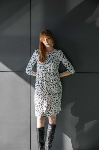 Biała sukienka w delikatny czarny wzorek. Uszyta z tkaniny wiskozowej, przyjemnej w noszeniu. Dekolt okrągły. Sukienka w kształcie litery A, poniżej karczka rozszerza się, dzięki poziomym, zmarszczonym klinom. W bocznych szwach znajdują się wpuszczane kieszenie. Krój rękawa prosty o długości 3/4. Sukienka zakładana przez głowę, zapinana na karku na mały guzik.