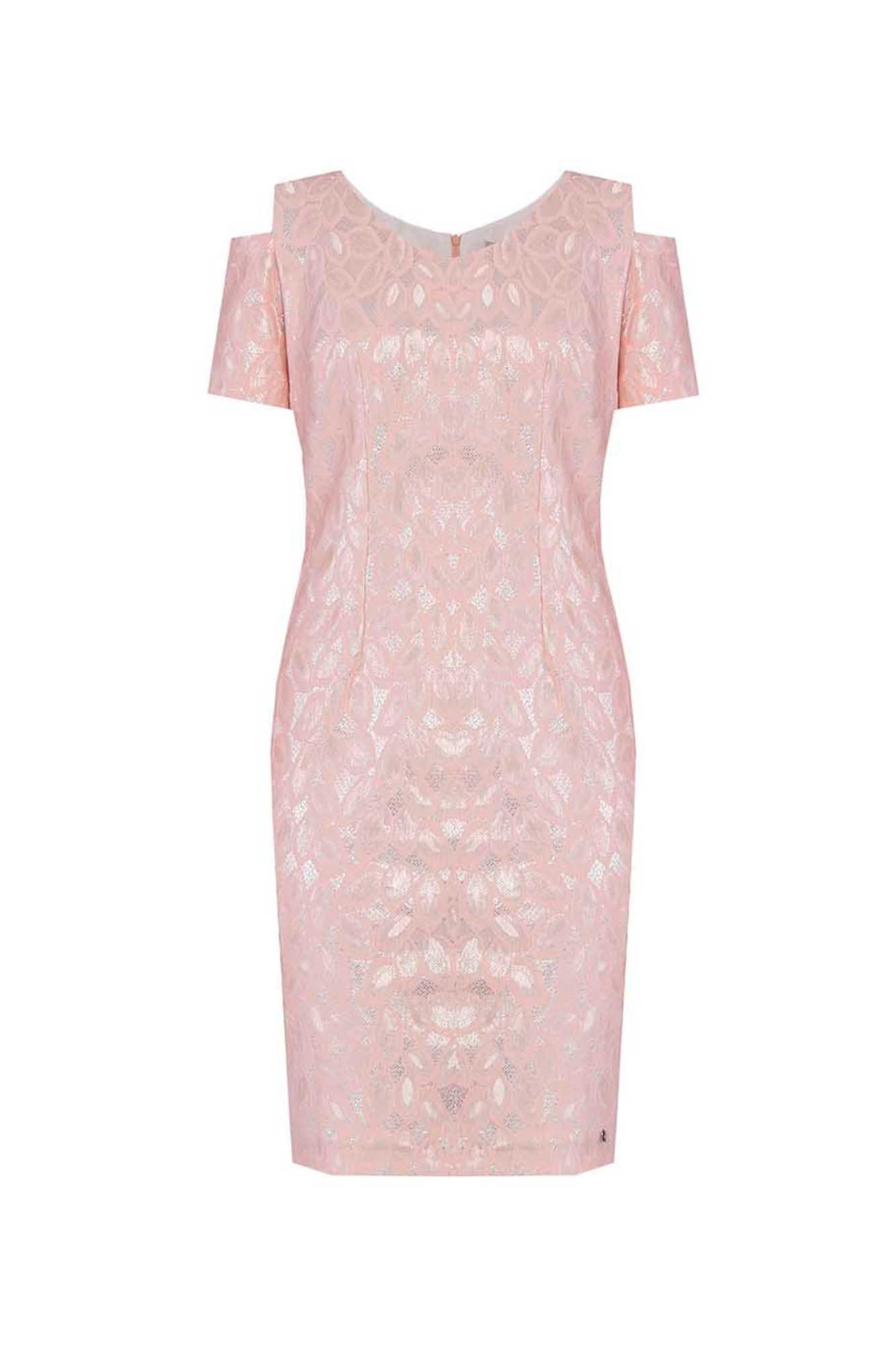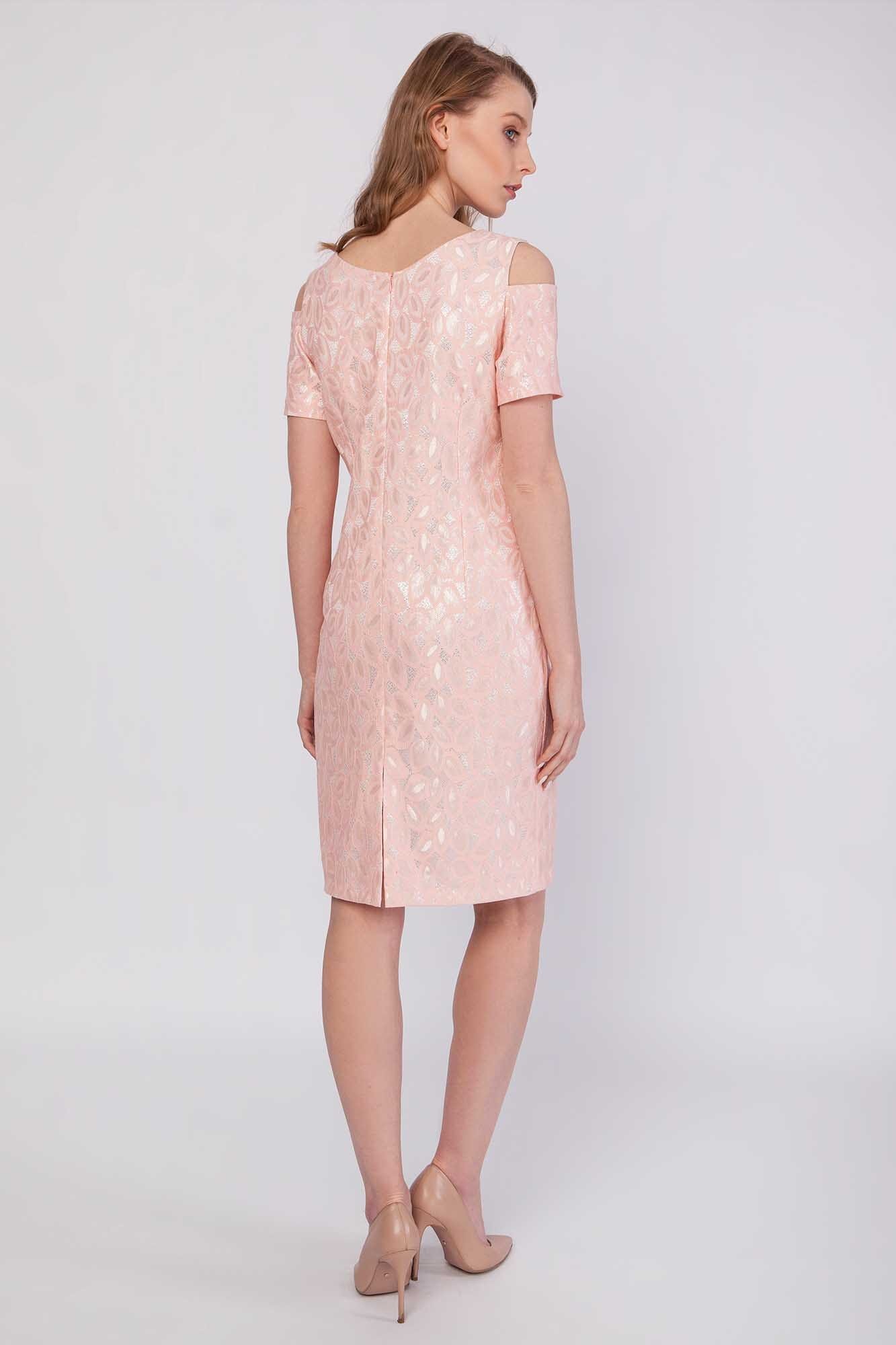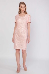 Elegancka różowa sukienka z krótkimi rękawami. Uszyta została z mieniącej się tkaniny, na którą naklejono koronkę. Z przodu i z tyłu odszyto długie zaszewki sprawiające, że sukienka idealnie dopasowuje się do sylwetki i podkreśla jej atuty. Sukienka ma szerokie ramiączka poniżej, których znajdują się doszyte krótkie rękawki. Z tyłu zapinana jest na długi, kryty suwak. Sukienka posiada też pęknięcie u dołu, ułatwiające poruszanie się. Ten model jest dostępny do rozmiaru 52. Sukienka jest idealną propozycją na rodzinne uroczystości takie, jak wesele, komunię, chrzciny.