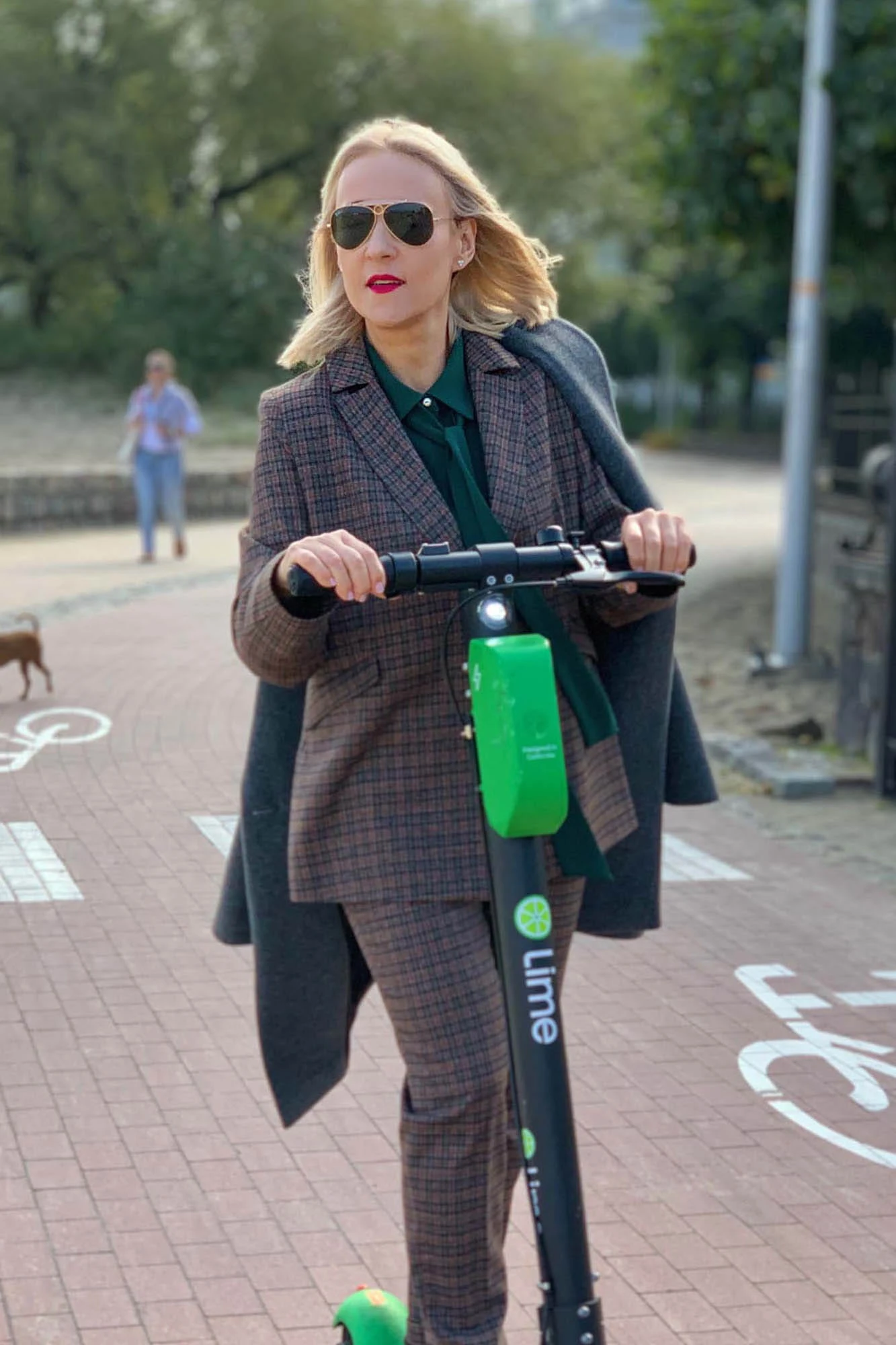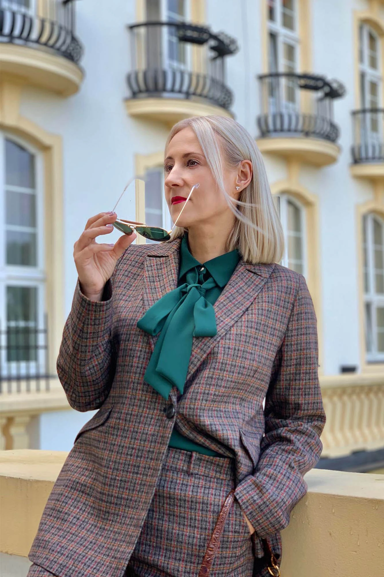 Przedłużany klasyczny żakiet w kolorową kratkę. Uszyty z miękkiej tkaniny z domieszką wysokogatunkowej wiskozy. Na przodzie, od linii kieszeni w górę, znajdują się modelujące, pionowe zaszewki. Żakiet posiada dwie ukośne kieszenie z patkami. Zapinany jest na jeden guzik. Żakiet, w połączeniu ze spodniami (klik) z tej samej tkaniny, sprawdzi się jako propozycja do pracy.