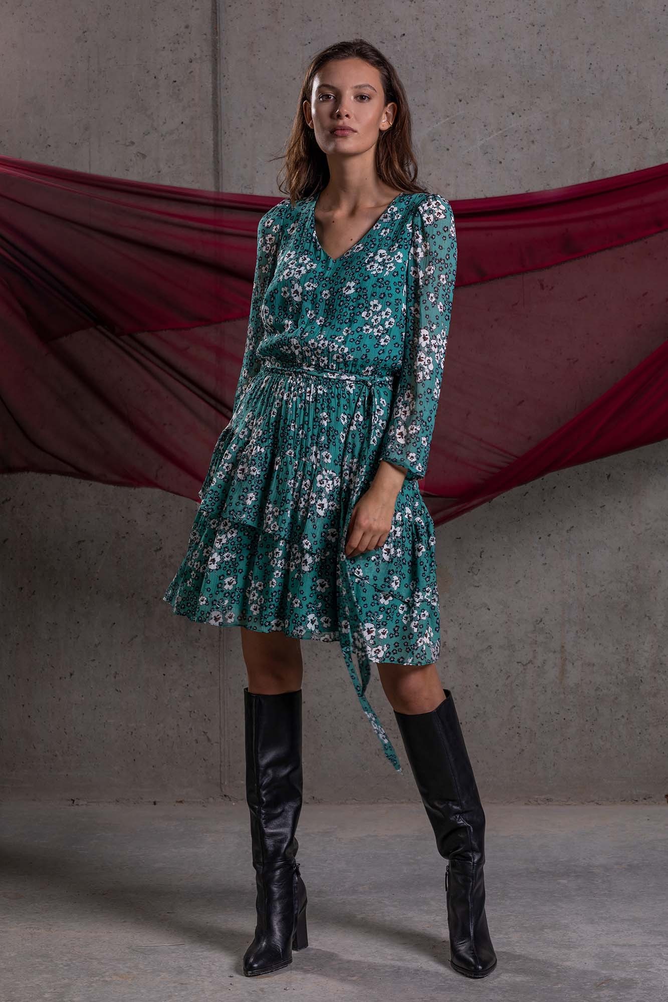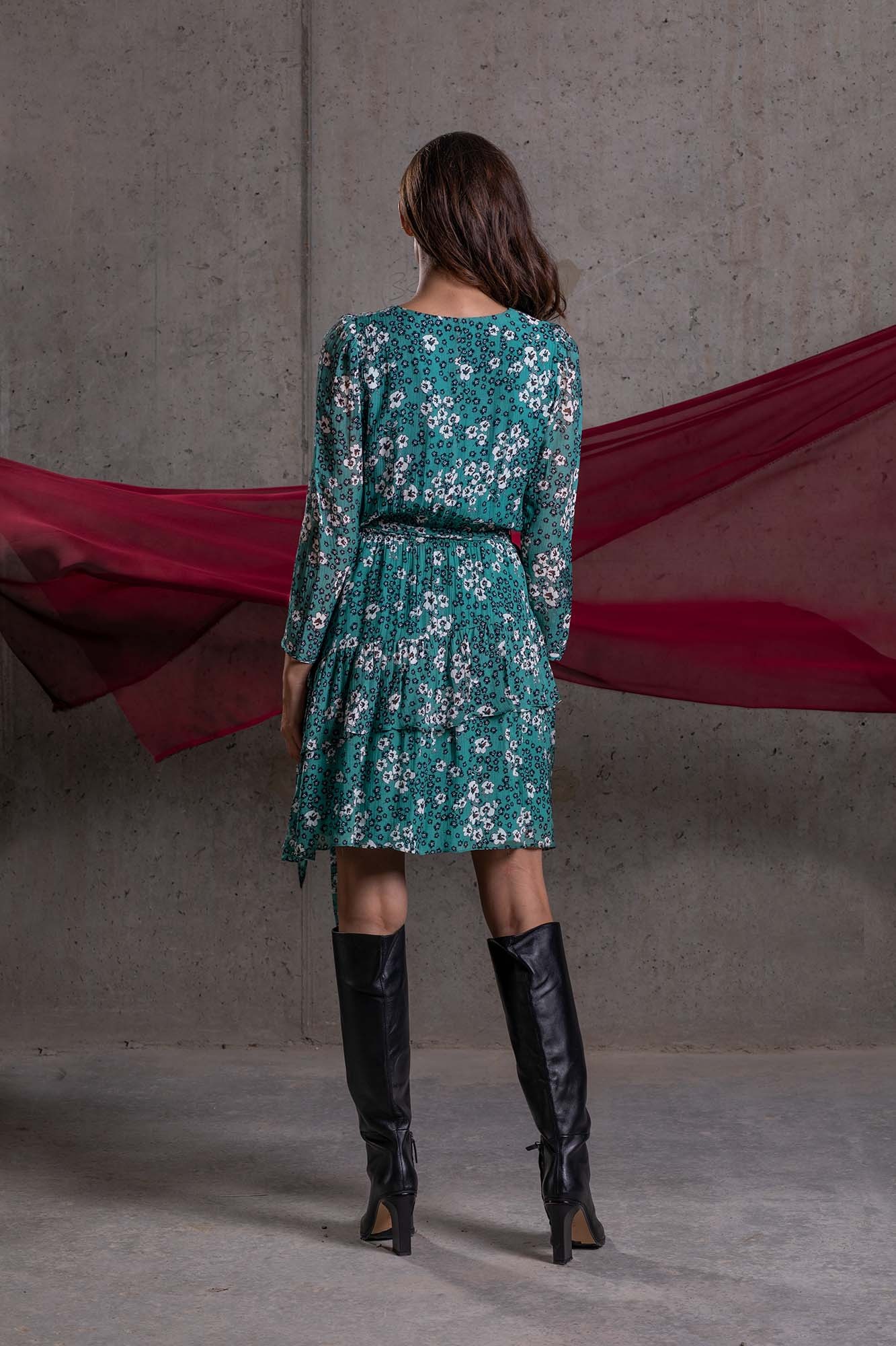 Sukienka w kwiaty z bufkami. Uszyta ze zwiewnej, kreszowanej tkaniny. Dekolt w kształcie litery V. W talii gumka i tekstylny pasek, podkreślający kobiece kształty. Spódnica rozkloszowana z wszytą asymetryczną falbaną. Długie rękawy z bufkami na ramionach. Sukienka zakładana jest przez głowę i posiada podszewkę.
