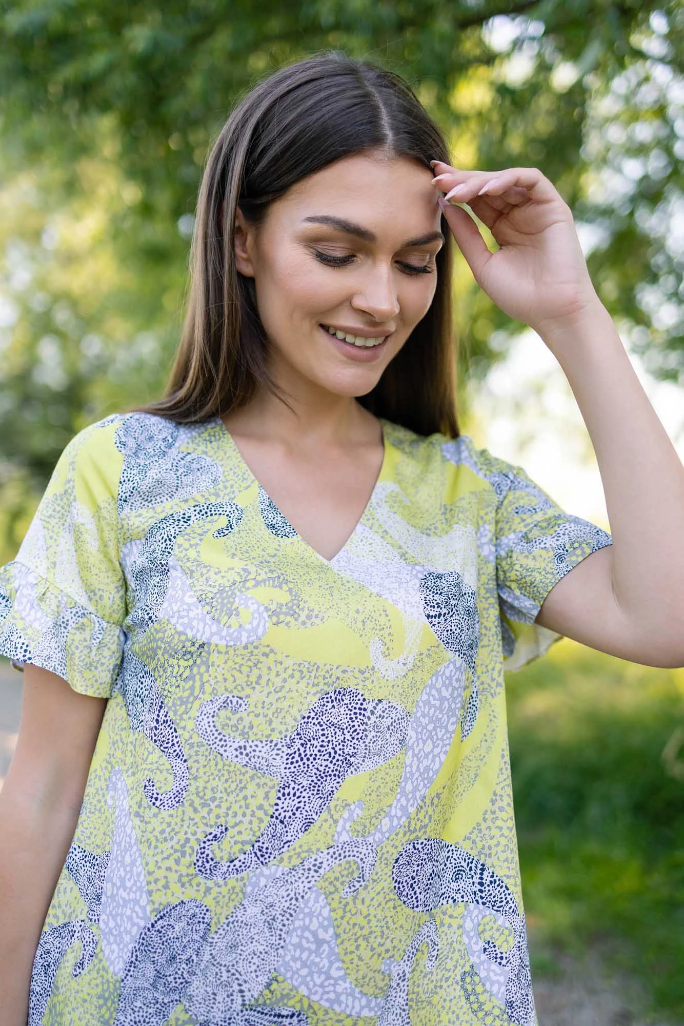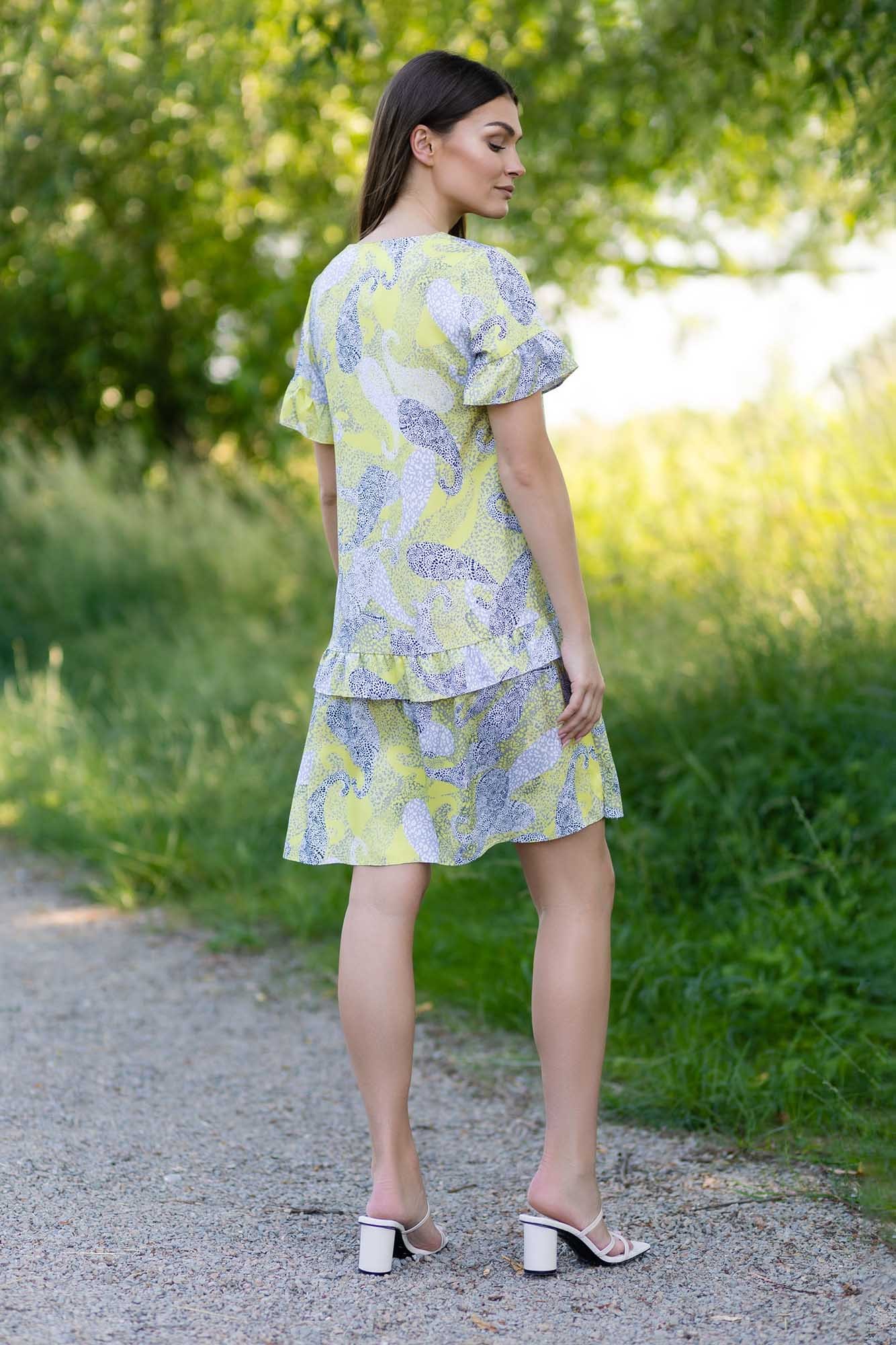 Wiskozowa sukienka z delikatnym motywem zwierzęcym. Uszyta z przyjaznej dla skóry tkaniny wiskozowej. Krótkie rękawki oraz dół sukienki zdobią małe falbanki, dodające sukience delikatności i kobiecego uroku. Dekolt w kształcie litery V. Sukienka zakładana jest przez głowę. Nie posiada podszewki.